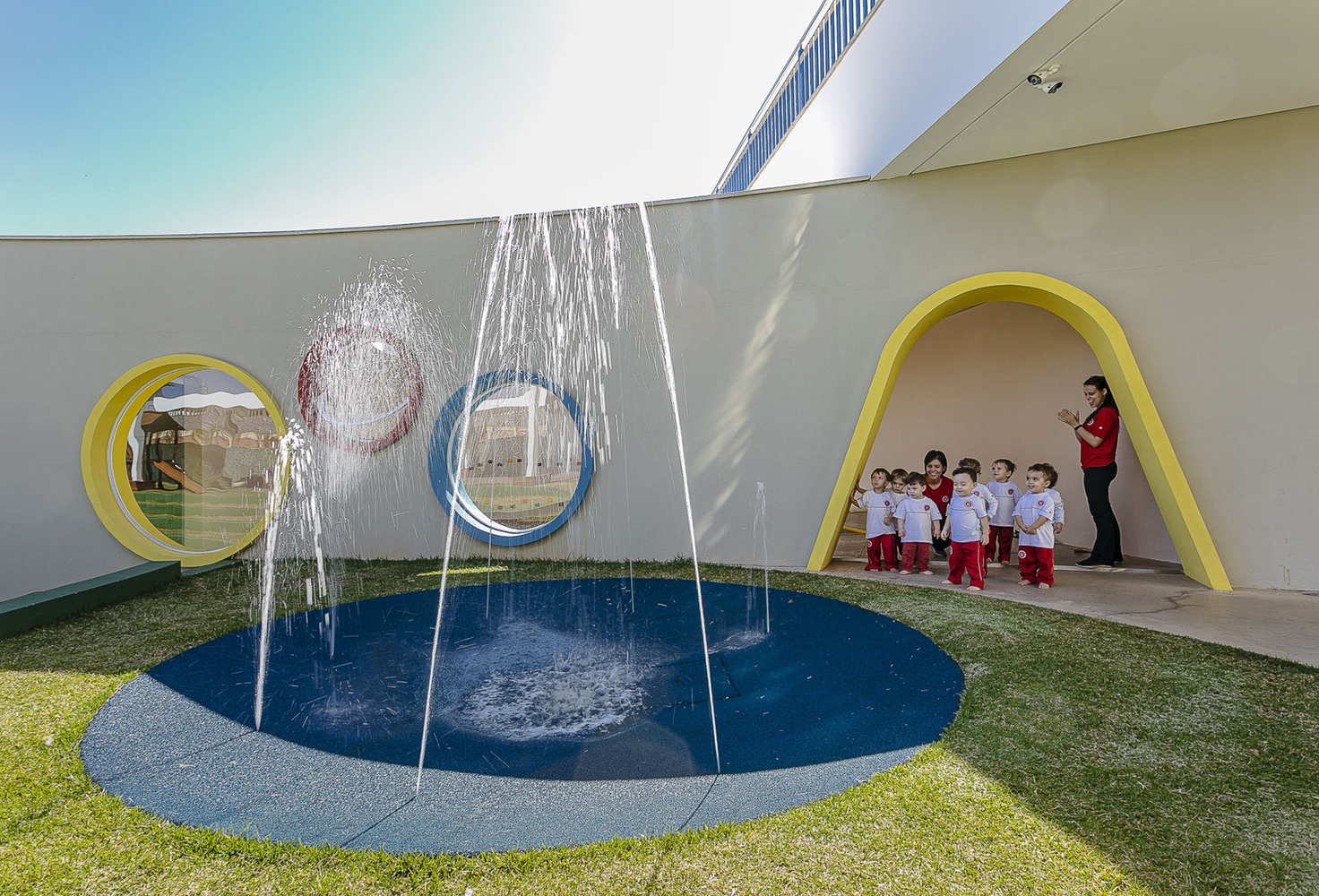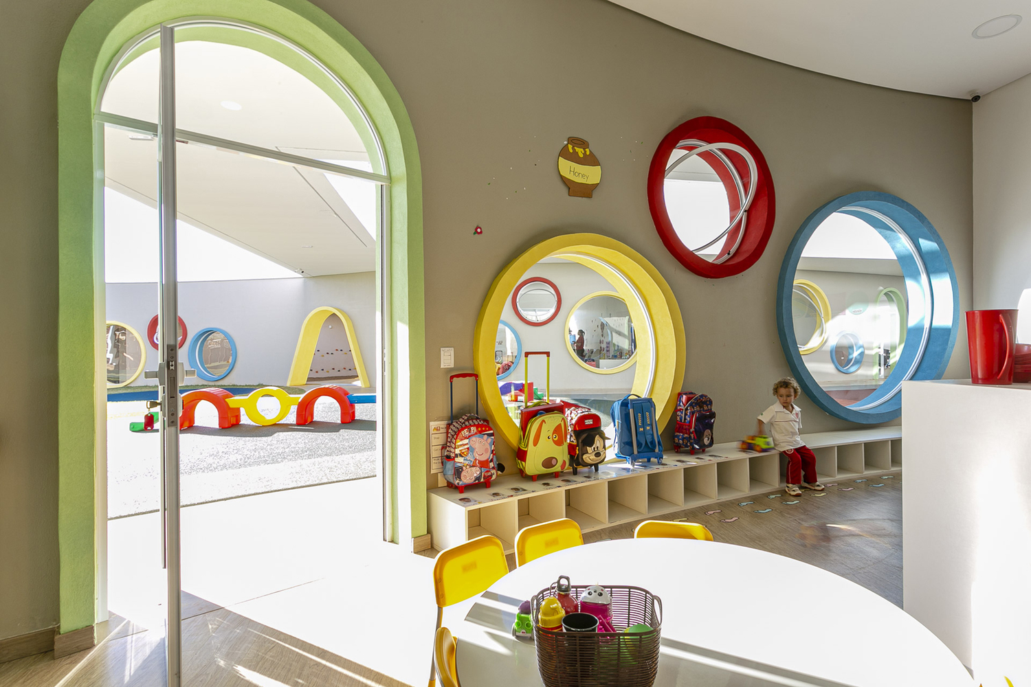 O elemento arquitetônico mais marcante são os anéis de concreto coloridos que configuram as janelas das salas de aula e do anfiteatro. Com tamanhos variados, esses círculos rompem com a ortogonalidade geral do projeto e imprimem caráter divertido ao edifício. Implantados em paredes curvas que percorrem todo o pavimento inferior, conferem unidade compositiva e revelam uma arquitetura que dialoga diretamente com o universo infantil, sem infantilizar o espaço.