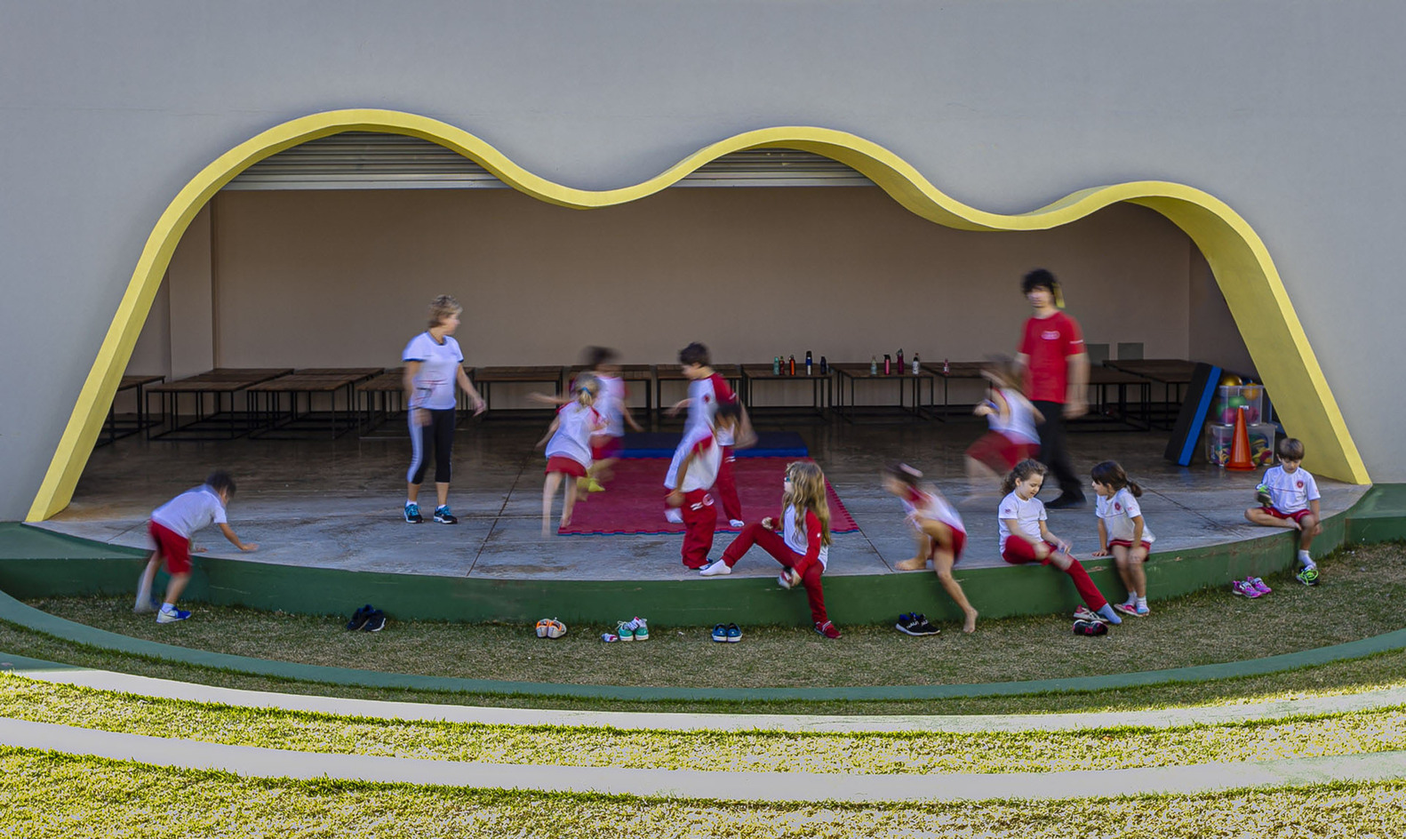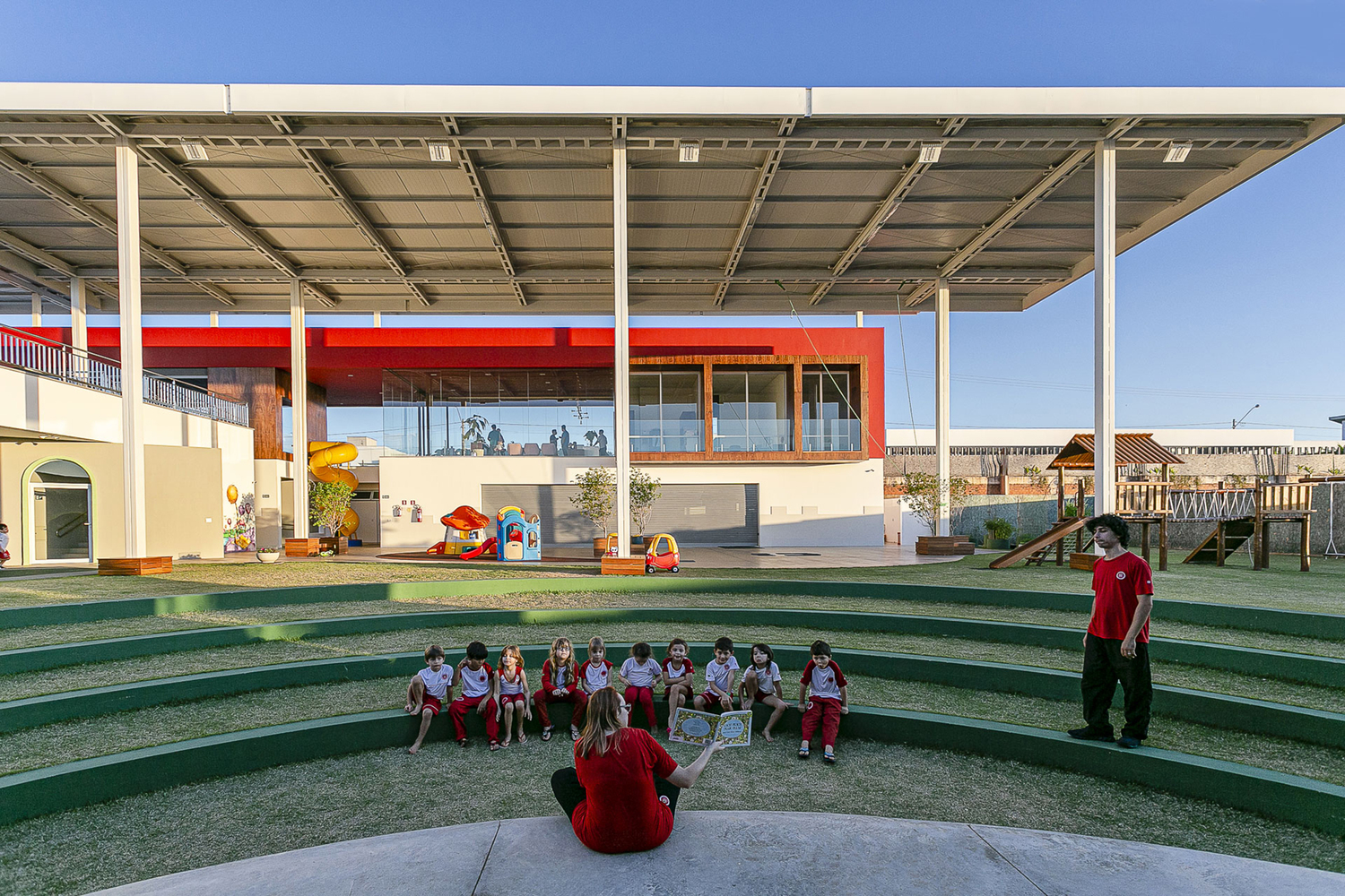 Todos os ambientes da escola voltam-se para um generoso gramado com anfiteatro, que funciona tanto para apresentações internas quanto externas. A plateia pode acomodar-se tanto nos assentos internos quanto no jardim externo, onde a própria grama escalonada em níveis serve de arquibancada. Essa solução dissolve os limites entre construído e paisagem, criando um espaço democrático e informal para atividades culturais e pedagógicas.