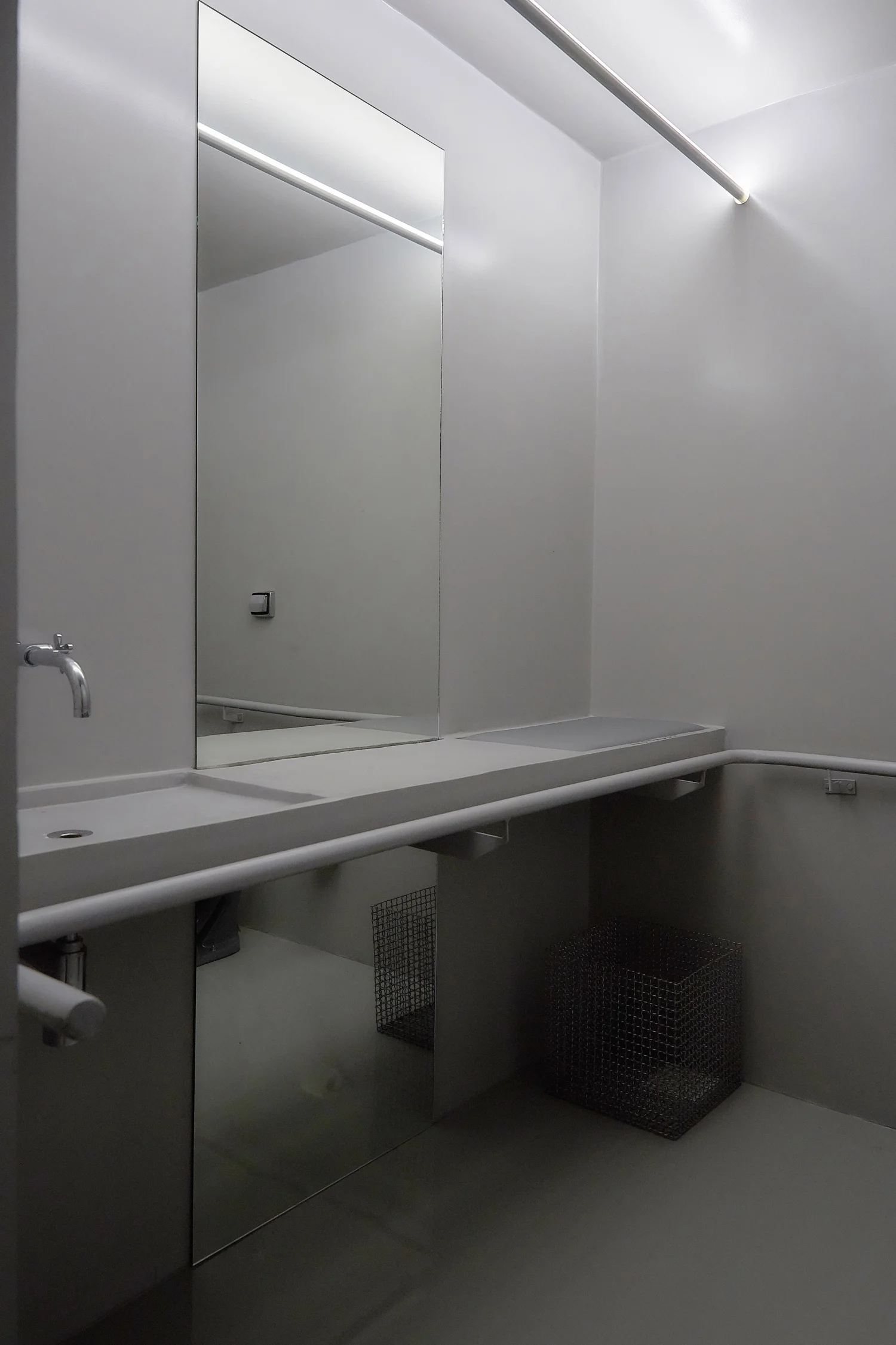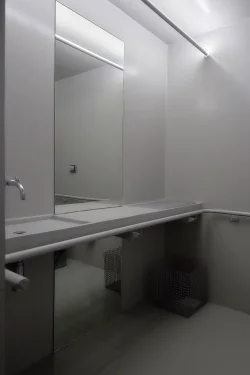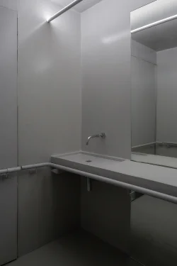 O agenciamento visual e físico dessa ausência massiva nos faz pensar que este é um projeto de arquitetura do invisível. Um paralelo entre o conceito "on-off" do Archigram, abstrato e concreto, a binária combinação polar em que um reforça ao outro. Conceitualmente, o projeto se coloca entre as mais diversas dialéticas e tensões, como a não separação de banheiro para clientes, o qual é apenas um, agênero.