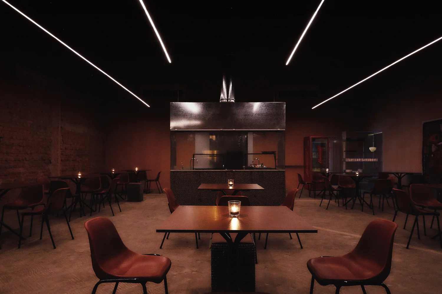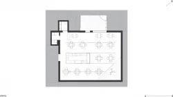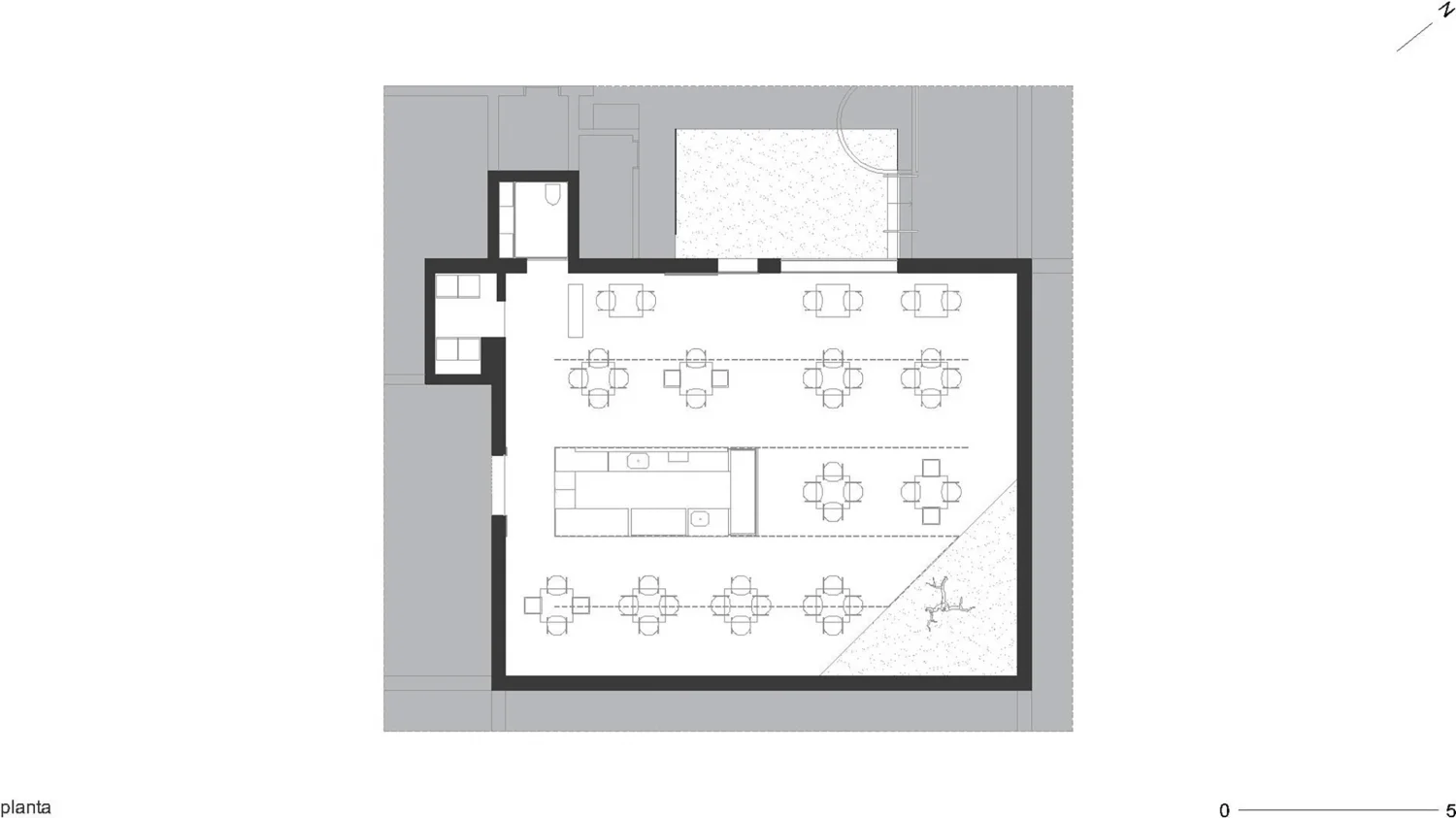 Ao invés de intervir, a proposta optou por uma organização que muito aceita e pouco se impõe em relação ao pré-existente no prédio. Esses planos visuais ortogonais resultaram naquilo que seria o partido do projeto: a ausência. Uma caixa com um vazio ubíquo conformando o espaço. Como o programa destinado é o atendimento ao público, posicionou-se, de maneira isolada e central, uma estação de trabalho, a ilha, para a finalização dos pratos. Tem-se, portanto, a flexão mínima de elementos.