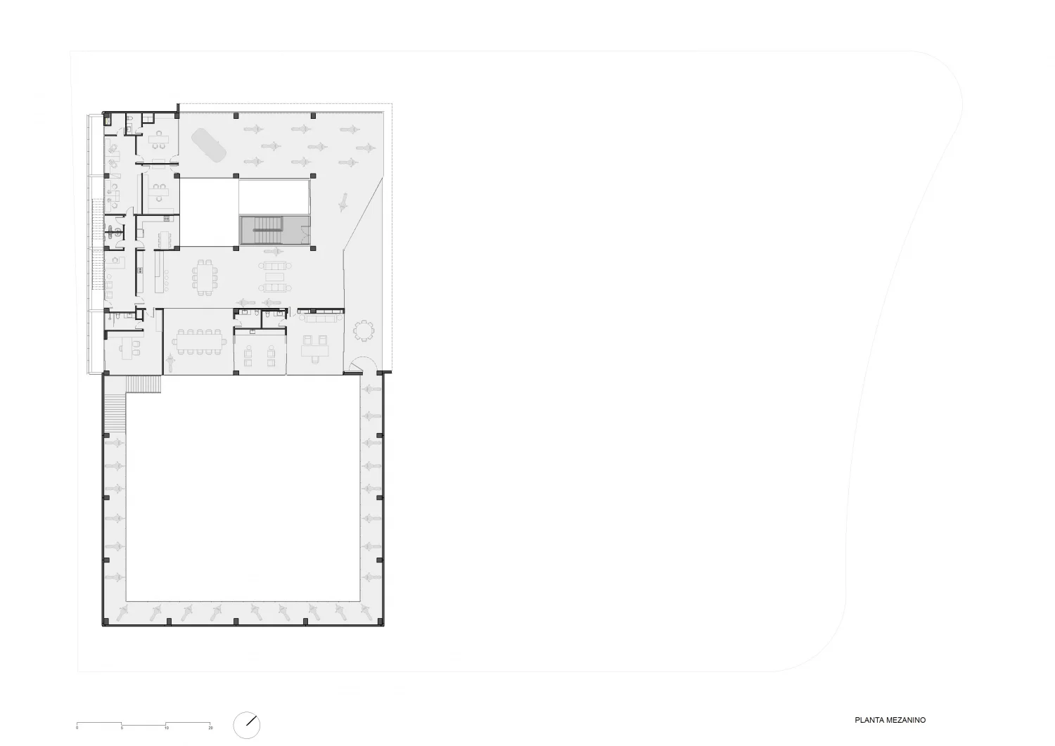 No centro do edifício, abre-se o átrio estruturado em uma complexa estrutura metálica, onde está locado um elevador de automóveis com capacidade para 3 toneladas, possibilitando um fácil deslocamento do acervo para todos os 3 pavimentos do edifício. Junto à caixa de elevador, encontra-se a escada de acesso principal dos pavimentos, também em estrutura metálica. O átrio central possibilita a entrada de luz controlada e a transparência entre um pavimento e outro.