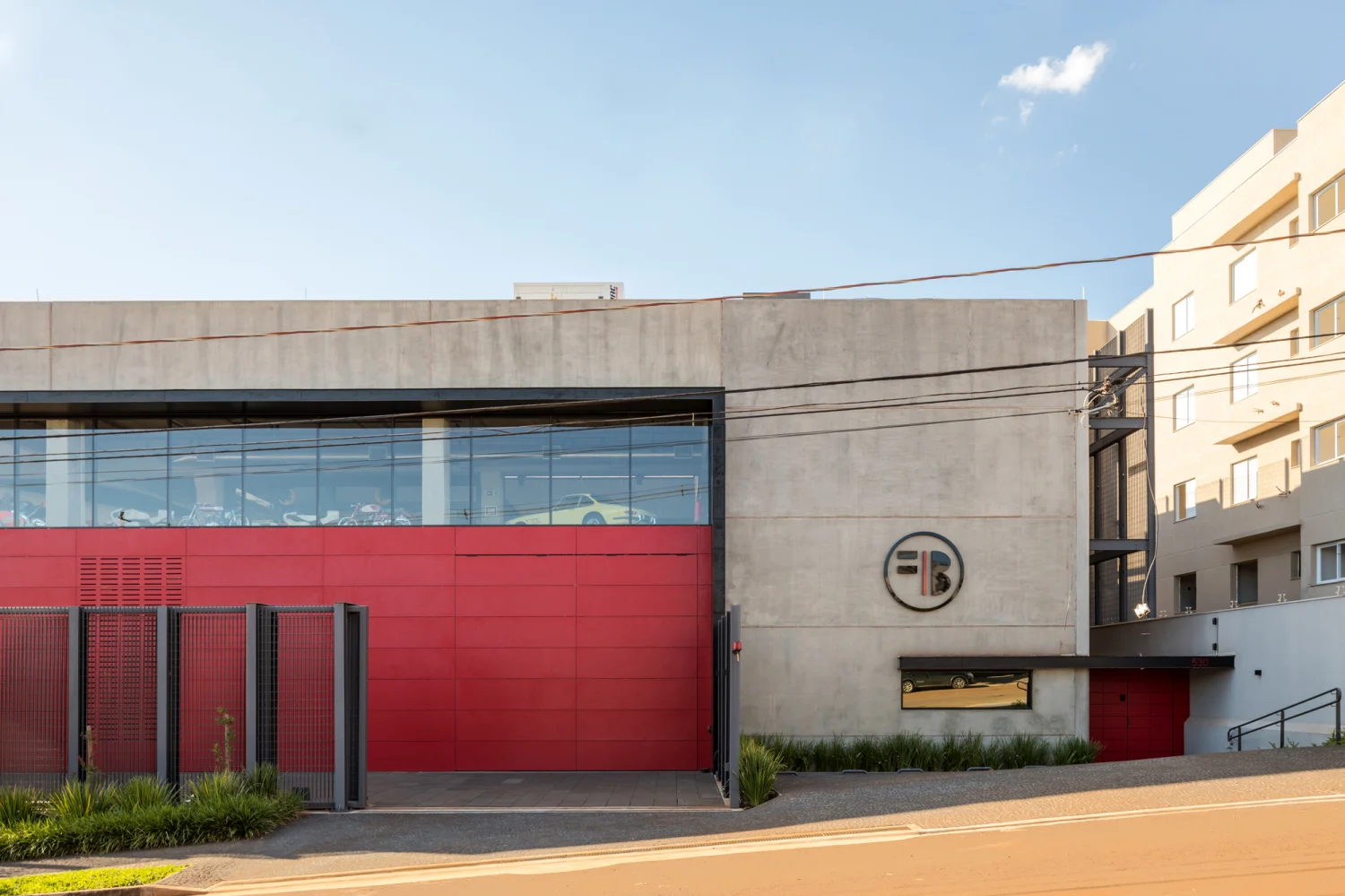 Na área externa, foi criada uma grade para a proteção e privacidade do edifício, que também permite abertura para 3 taludes, criados com o propósito de atender eventos do ramo e, ocasionalmente, usado como heliponto. Sob esses, foi instalado um reservatório de 70.000 litros de água pluvial que é captado pelo telhado, responsável por abastecer os vasos sanitários, torneiras da oficina e irrigação. Além dessa captação de águas pluviais, o telhado abriga um grande sistema de energia solar com mais de 160 placas fotovoltaicas com capacidade para gerar energia suficiente para tornar o prédio totalmente autossuficiente.
