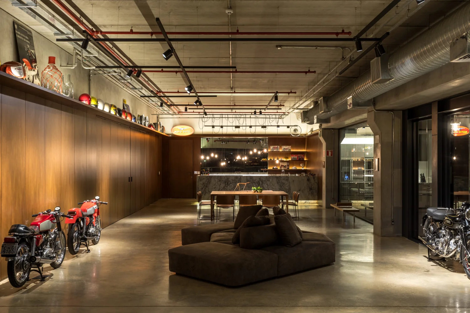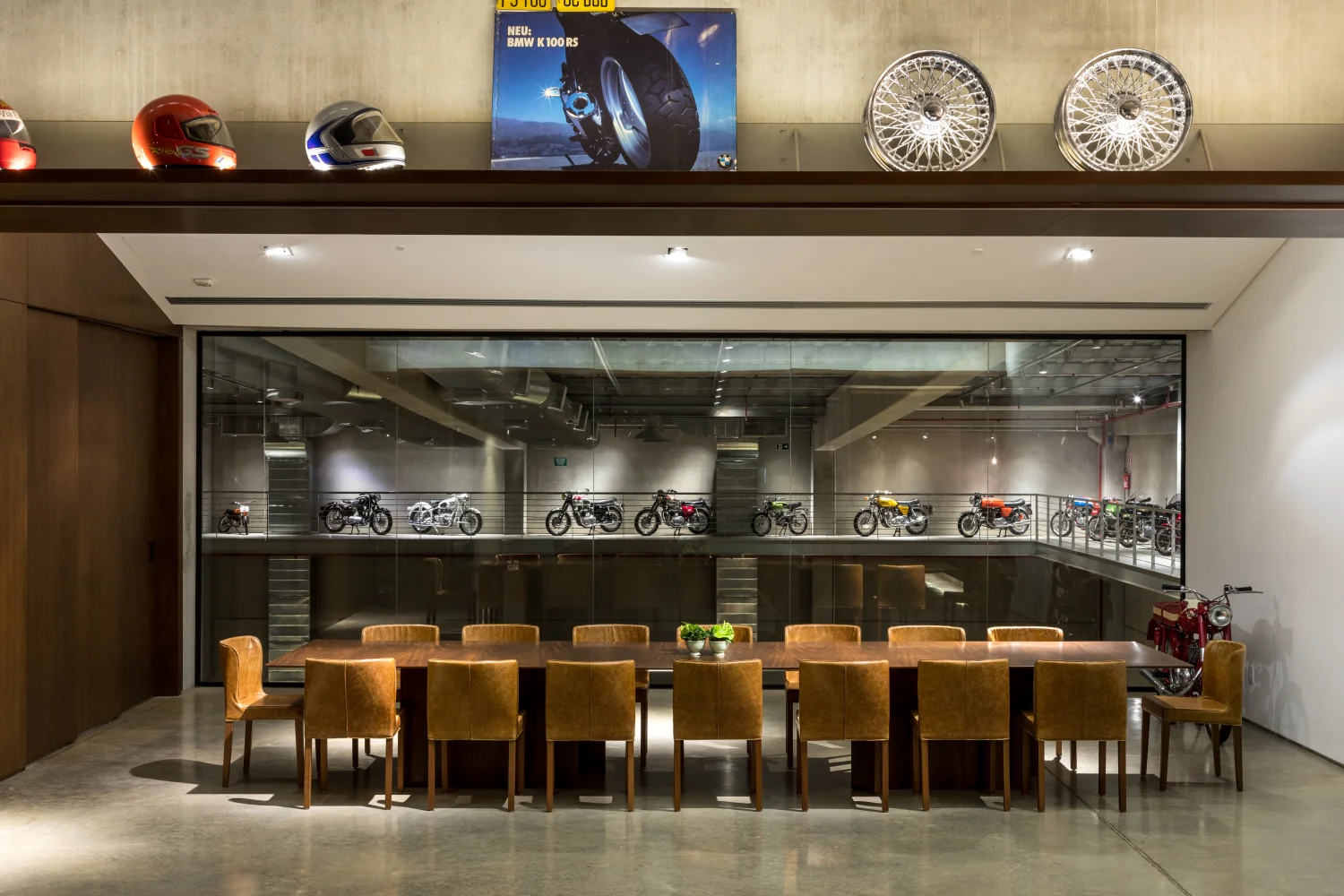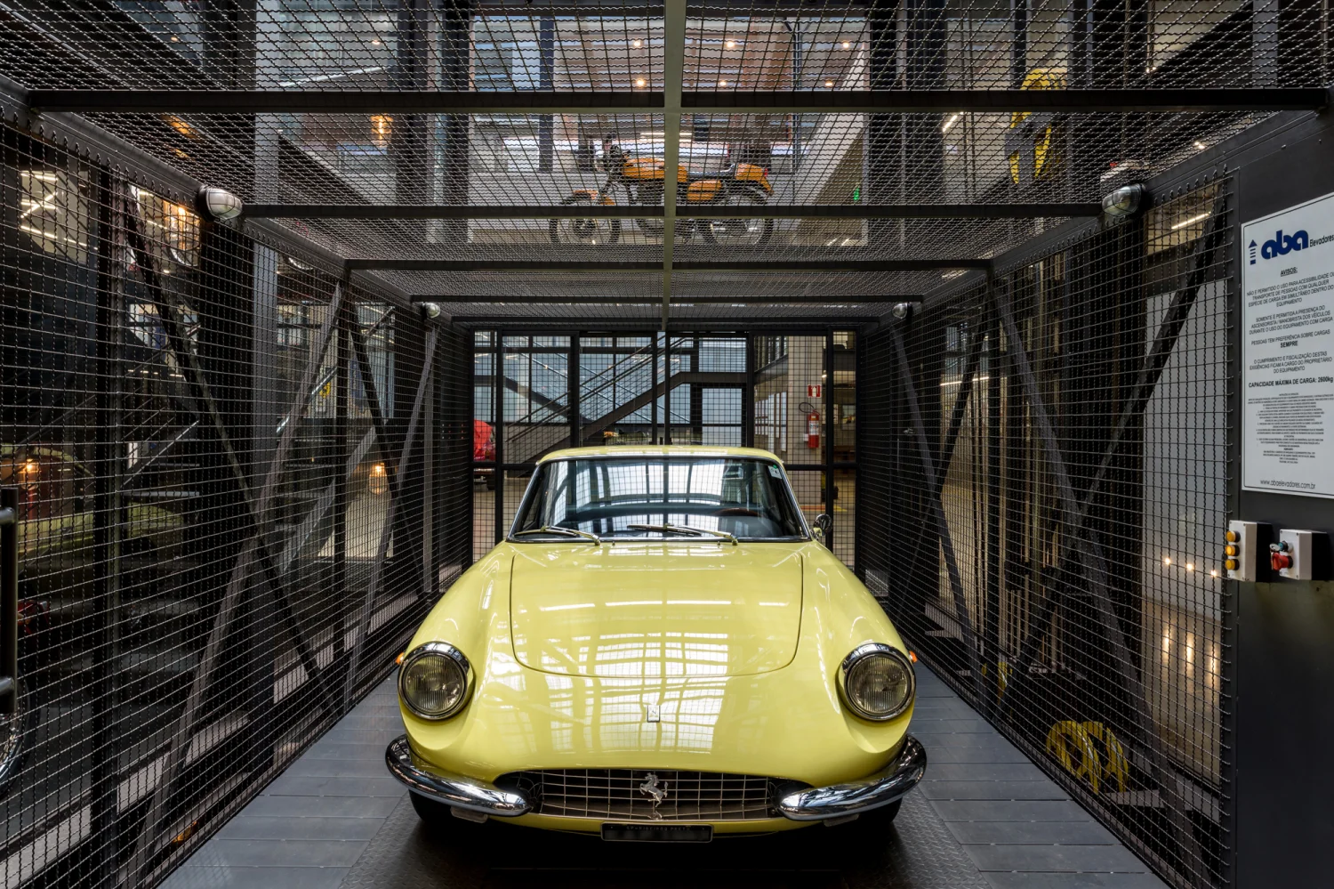 No térreo, localizam-se as oficinas e o pátio de exposição principal, este com um vão de impressionantes 30 metros de comprimento e pé direito de 9 metros de altura, executados em estrutura pré-fabricada. Nessa mesma estrutura, está fixada a passarela metálica onde são expostas as principais motos do acervo.