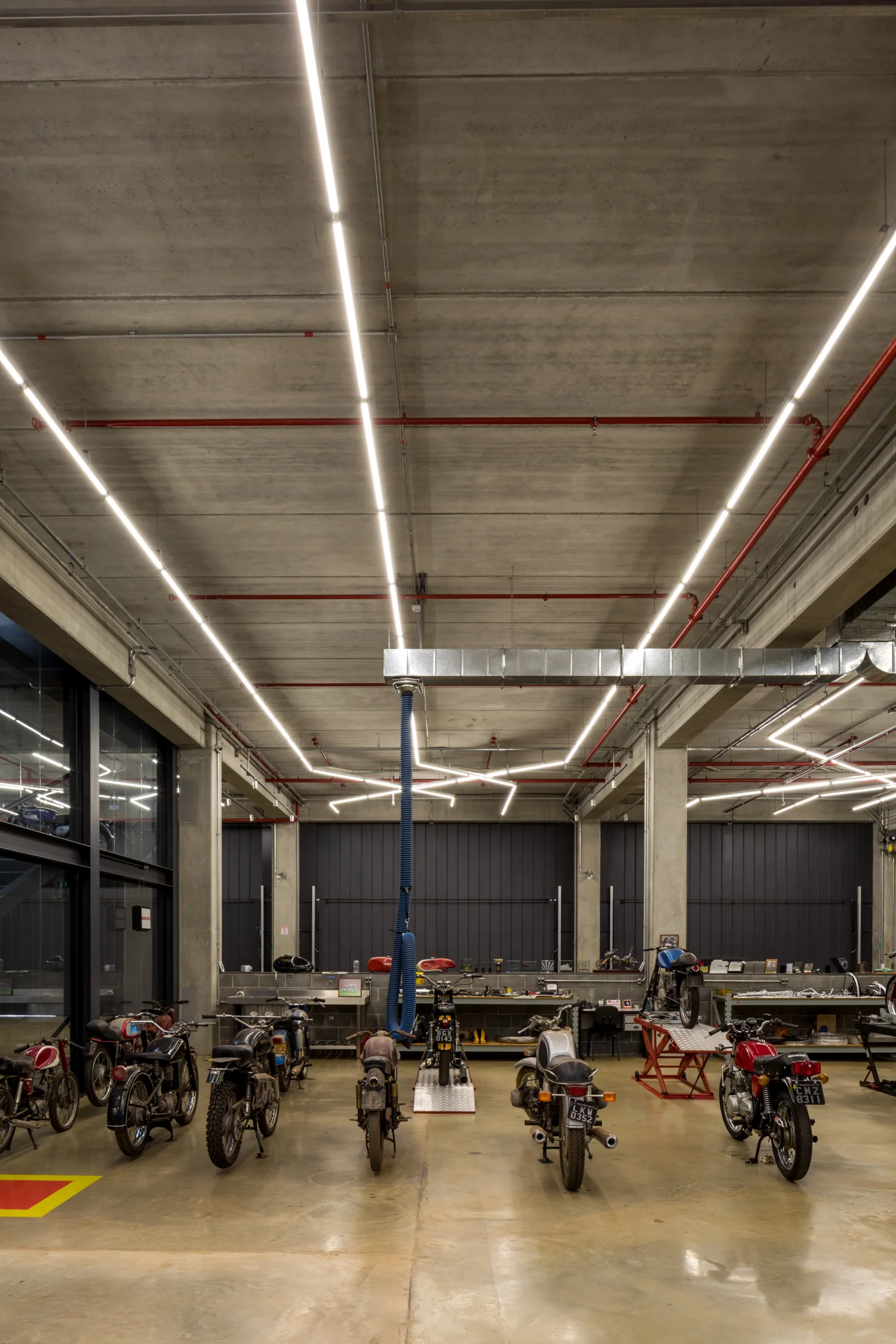 O edifício possui um complexo sistema de ar condicionado integrado com equipamentos de exaustão de fumaça que atendem as especificações do Corpo de Bombeiros e, também, mantêm a pressão interna positiva em dias de tempestade de poeira, conservando o acervo limpo. A iluminação é feita em LED com as tubulações galvanizadas aparentes, aspecto que ressalta o caráter industrial característico de uma garagem.
