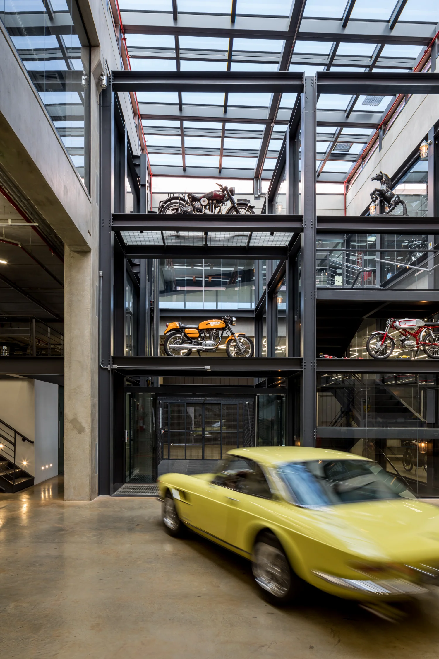 Garagem projetada para contemplação de um acervo automotivo que alia tecnologia, sustentabilidade e espacialidade monumental. Por: N2B Arquitetura.