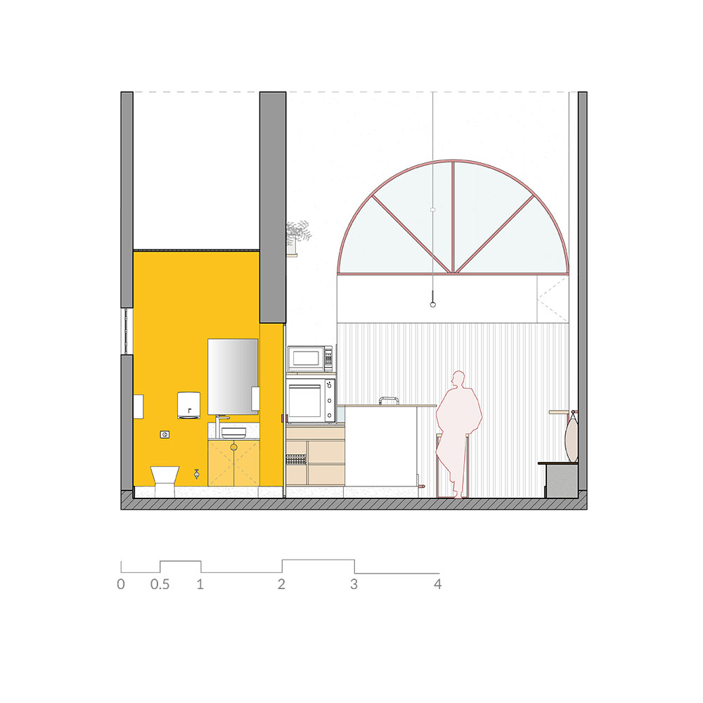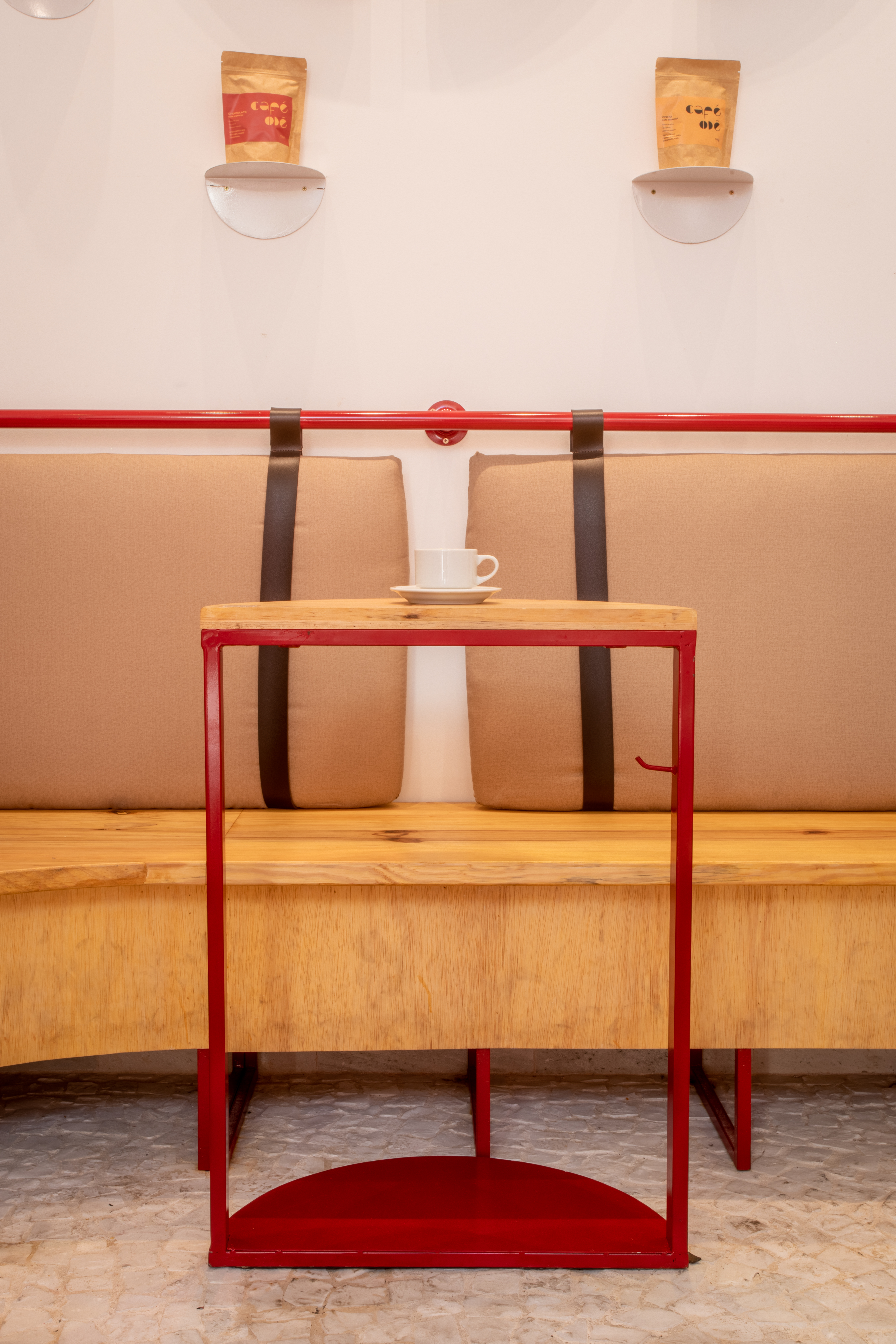 O ambiente é dividido por um balcão de alvenaria, que atende tanto interna quanto externamente. Se baseando nas formas e cores definidas na identidade visual, os mobiliários foram desenvolvidos para atender as demandas de um espaço limitado de aproximadamente 20m², possibilitando uma versatilidade para dias movimentados, com alternância entre banco com mesas de apoio, banquetas altas direto no balcão ou prateleiras de apoio para pessoas em pé.