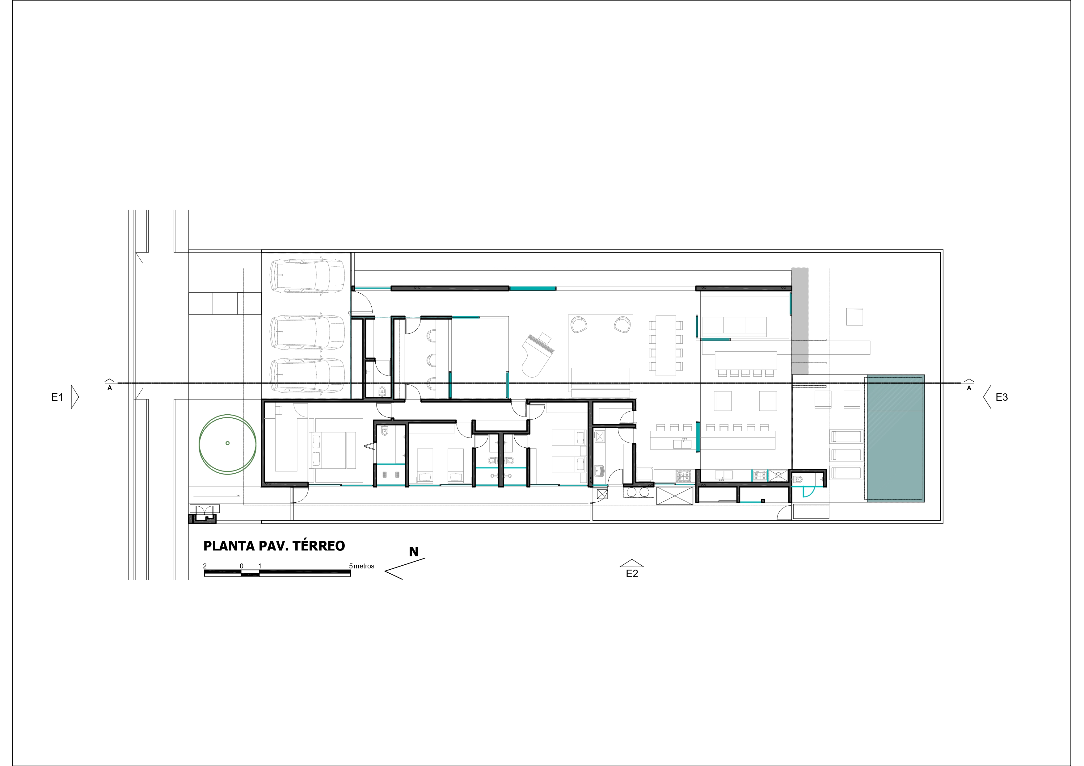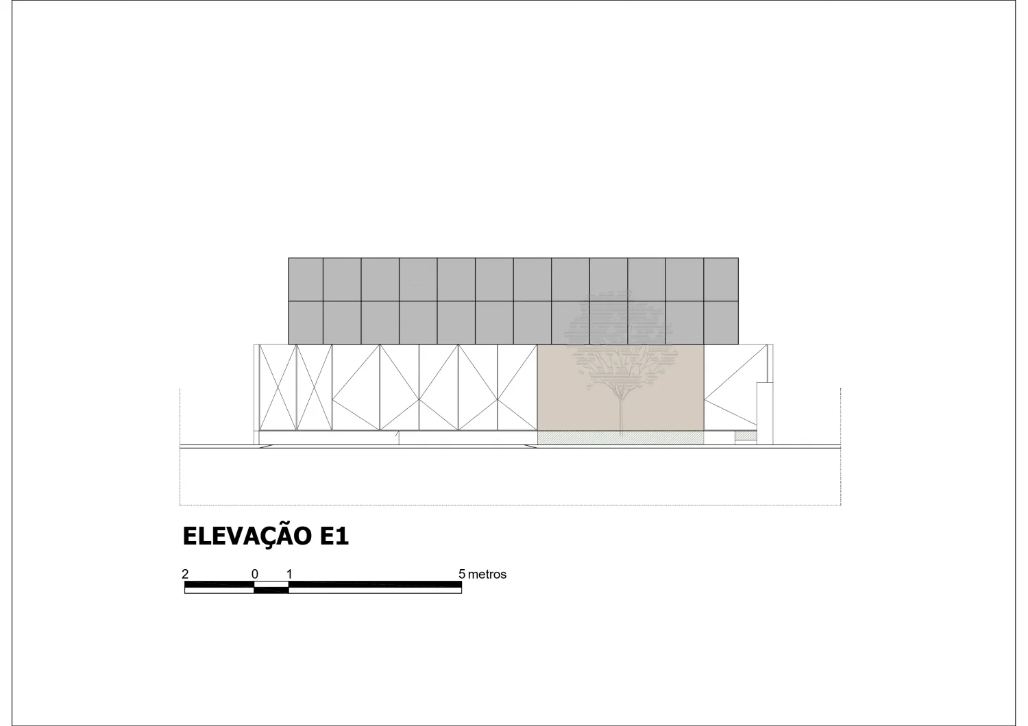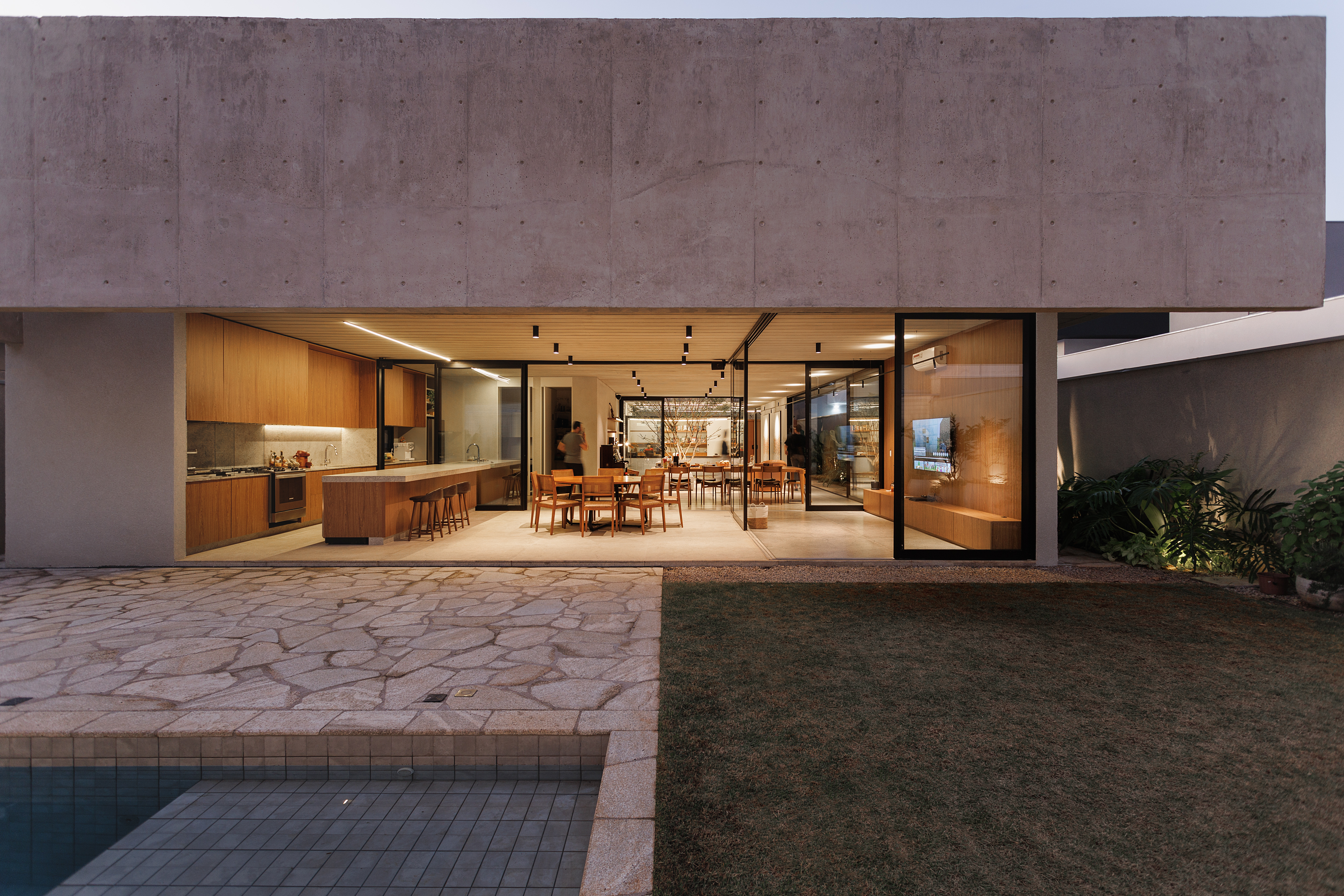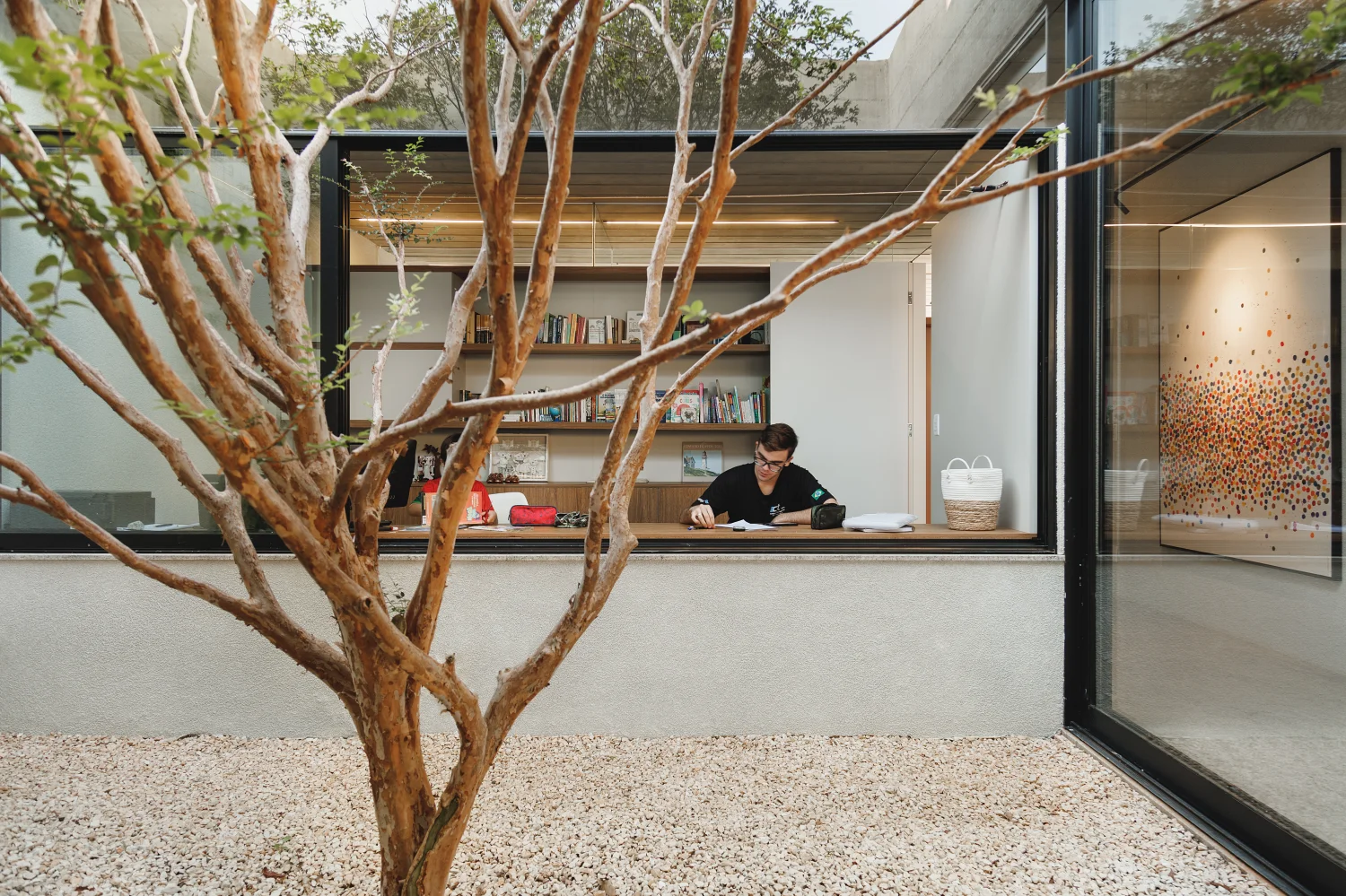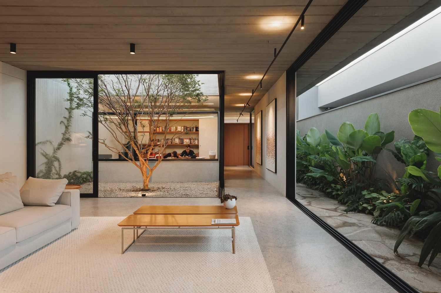 A dinâmica dos moradores, pautada pela música, artes plásticas e gastronomia, exigiu um programa funcional altamente integrado. O projeto responde com um setor social permeável, onde o escritório-ateliê e a sala de música são articulados por uma clareira central que abriga uma jabuticabeira. A transição para a área de lazer, composta por piscina e sala de televisão, é feita de forma fluida pela cozinha e área gourmet, garantindo que as atividades familiares ocorram em simultaneidade e harmonia.