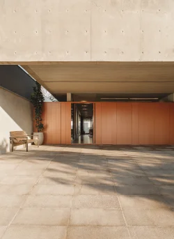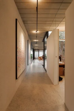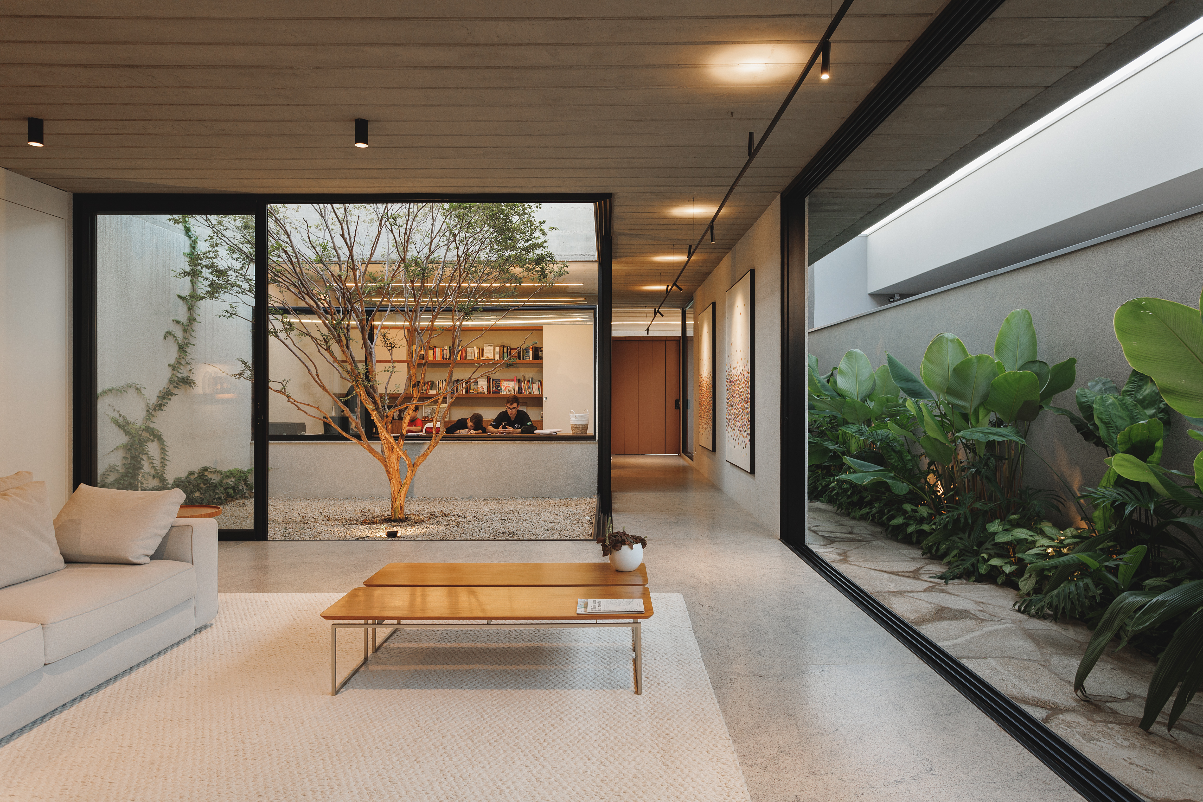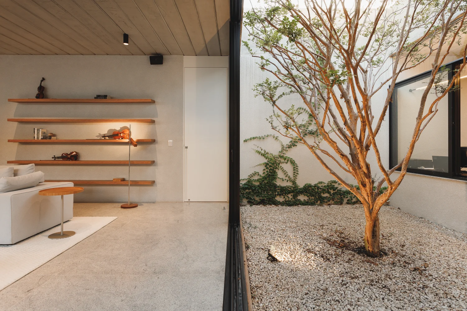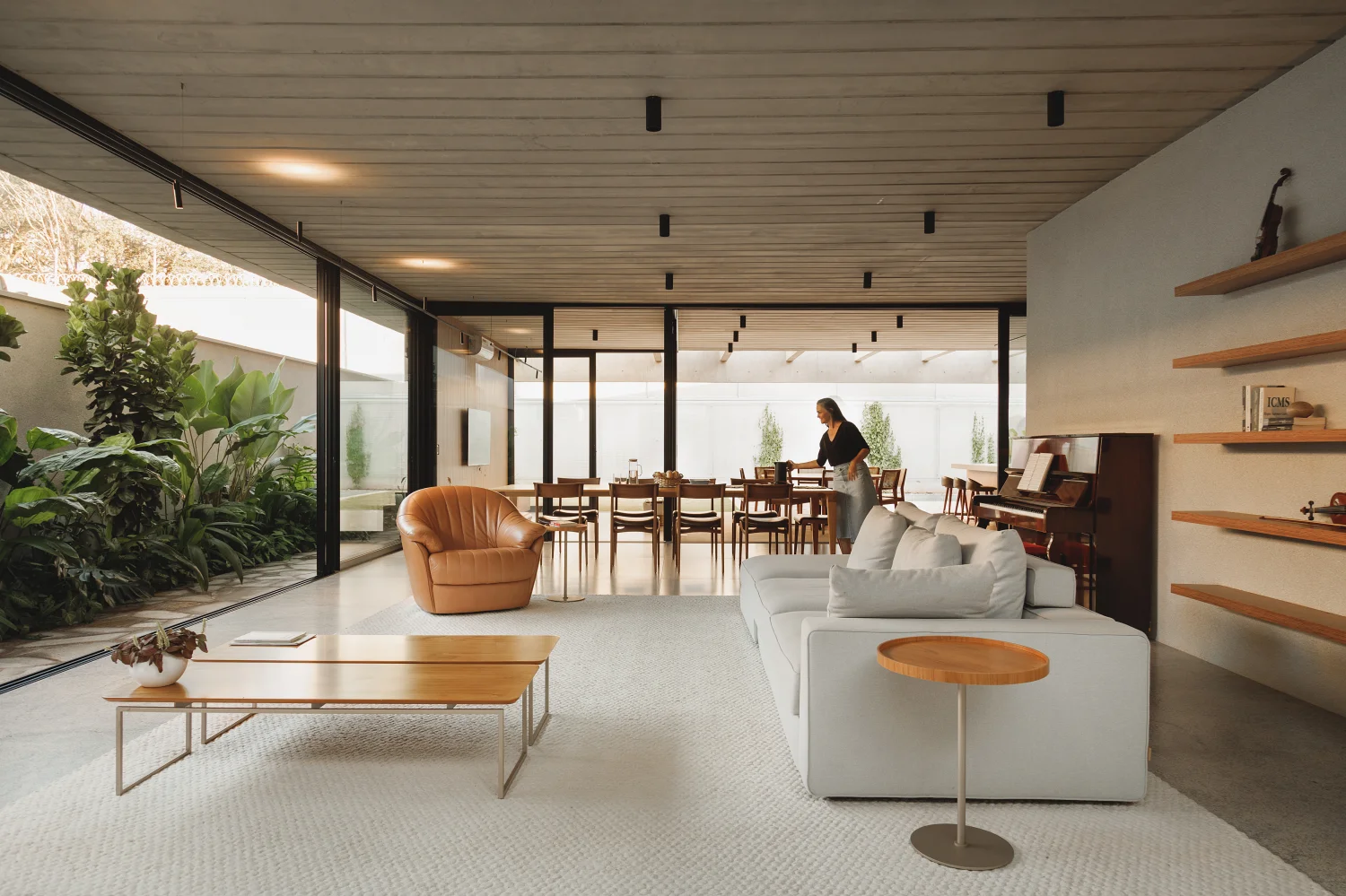 A privacidade em relação aos vizinhos é garantida pelo uso de um gabarito propositalmente mais baixo que o entorno. Esta escolha, somada ao plano único em laje painel, cria uma leitura visual contínua e ininterrupta do teto em toda a extensão da área social. A materialidade da residência prioriza elementos naturais e superfícies puras, resultando em uma arquitetura que interfere sutilmente no espaço e valoriza a experiência sensorial dos usuários.