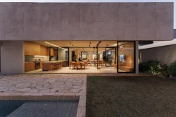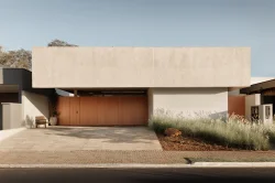 A Casa Quadros, projetada pelo escritório Gruta Arquitetos, foi concebida para abrigar uma família composta por um casal e três filhos em um lote de 620 m² em condomínio fechado. A implantação estratégica buscou organizar a compartimentação de maneira que os recuos obrigatórios fossem incorporados como áreas de integração social. Ao concentrar a ala íntima em um bloco longitudinal, a arquitetura estabelece um ponto de partida claro que libera o restante do terreno para o convívio.