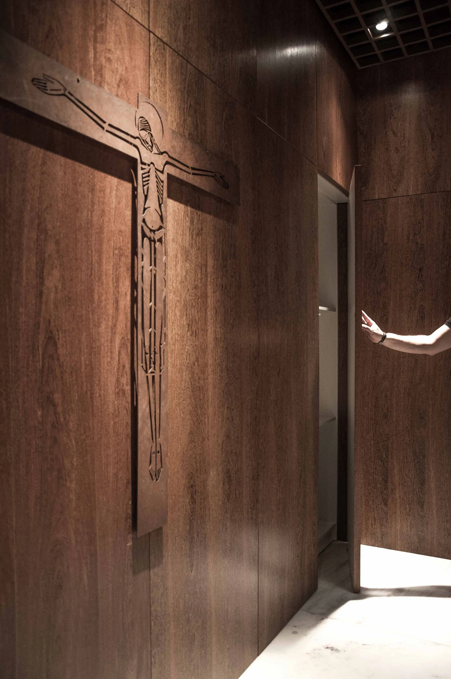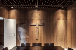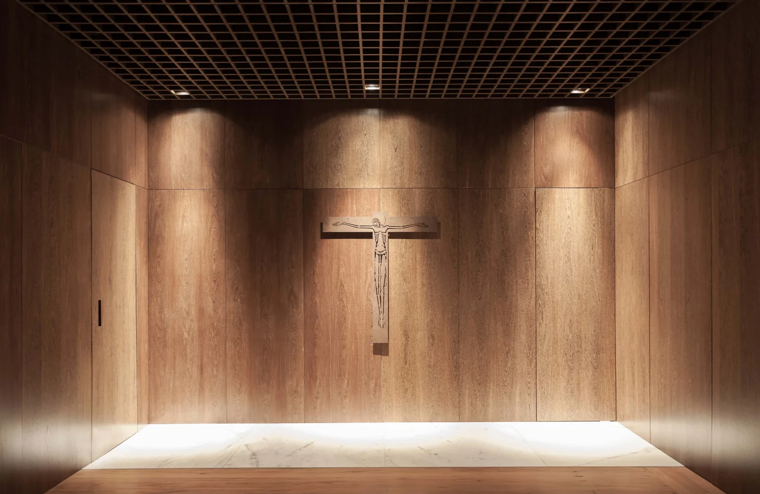 “A intenção do projeto foi levar para a sala alguns elementos característicos da arquitetura secular do Seminário Santo Antônio.” Diz Gruta Arquitetos. Cada detalhe, desde a recuperação do piso até a faixa de mármore que substitui a antiga sapata de concreto, atua como uma homenagem à história do edifício, conferindo-lhe a dignidade exigida por sua nova função sacra.