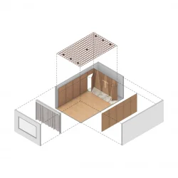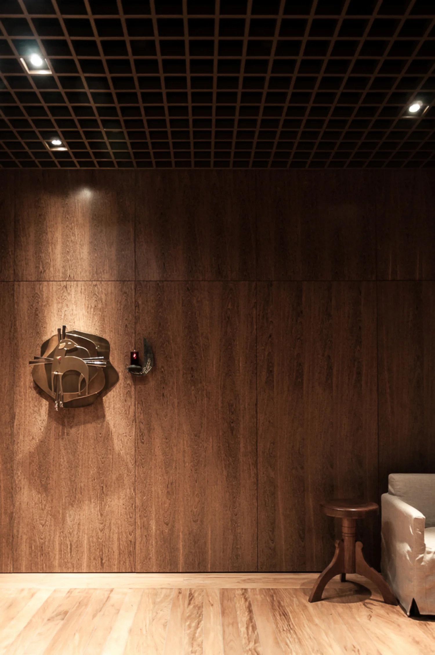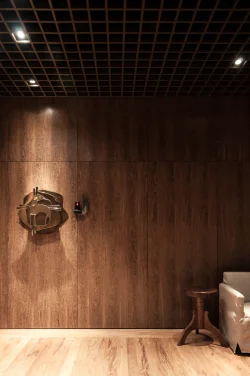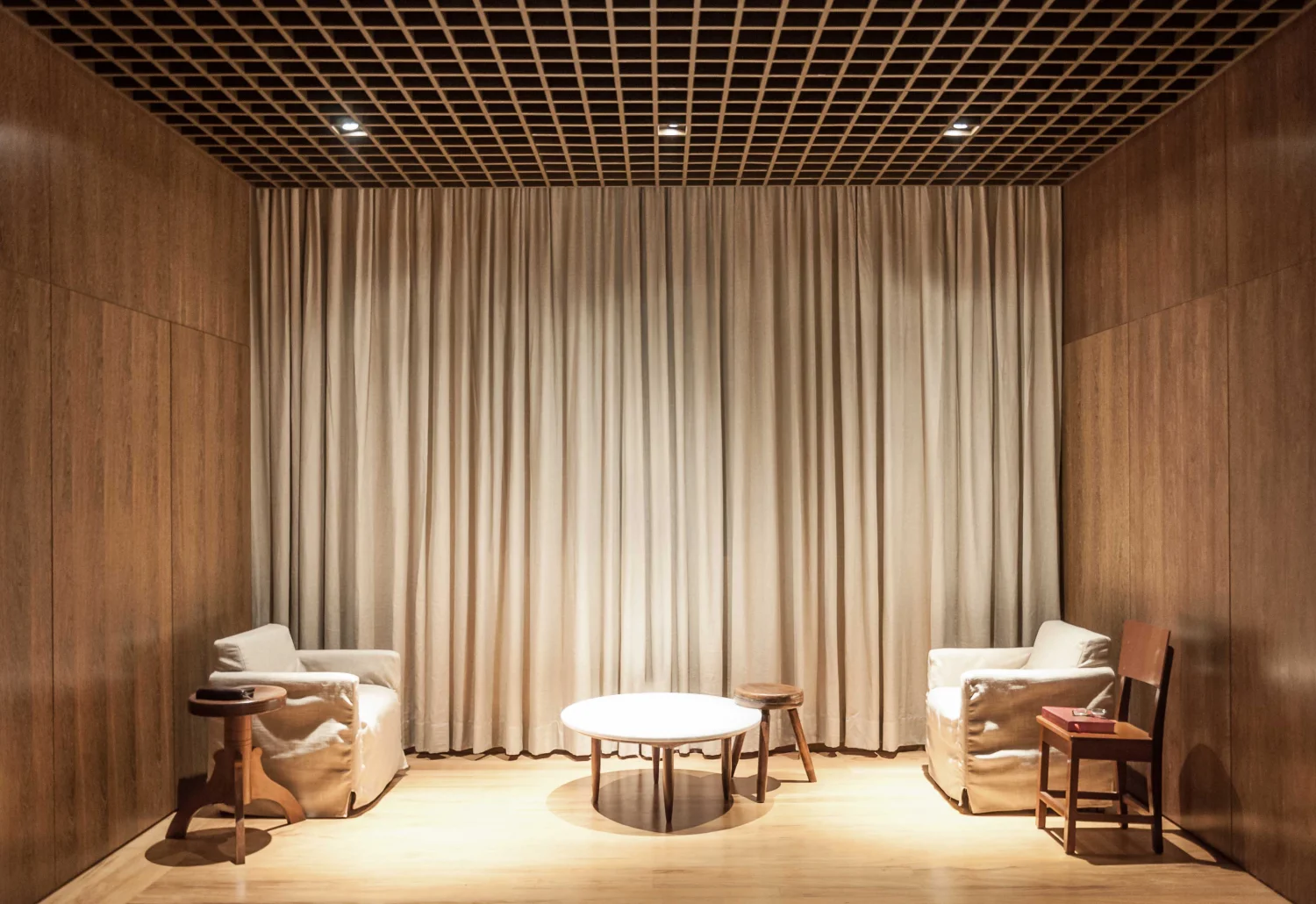 A premissa fundamental da intervenção foi o resgate de elementos característicos da arquitetura secular do seminário. O processo de restauro incluiu a recuperação do piso de madeira original, que recebeu tratamento para retomar sua integridade estética. Nas paredes, o uso de marcenaria com lâminas naturais evoca a atmosfera das alas de alojamento dos seminaristas, criando uma continuidade visual e tátil com as áreas de estudo da instituição. A substituição do forro de gesso por uma colmeia metálica estabelece uma conexão direta com o desenho do teto da capela principal do complexo.