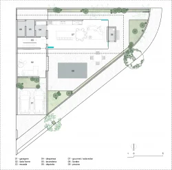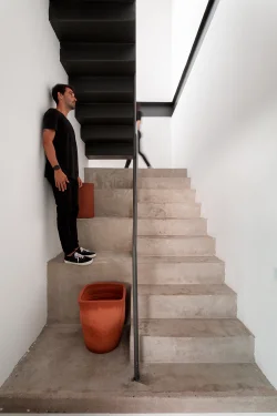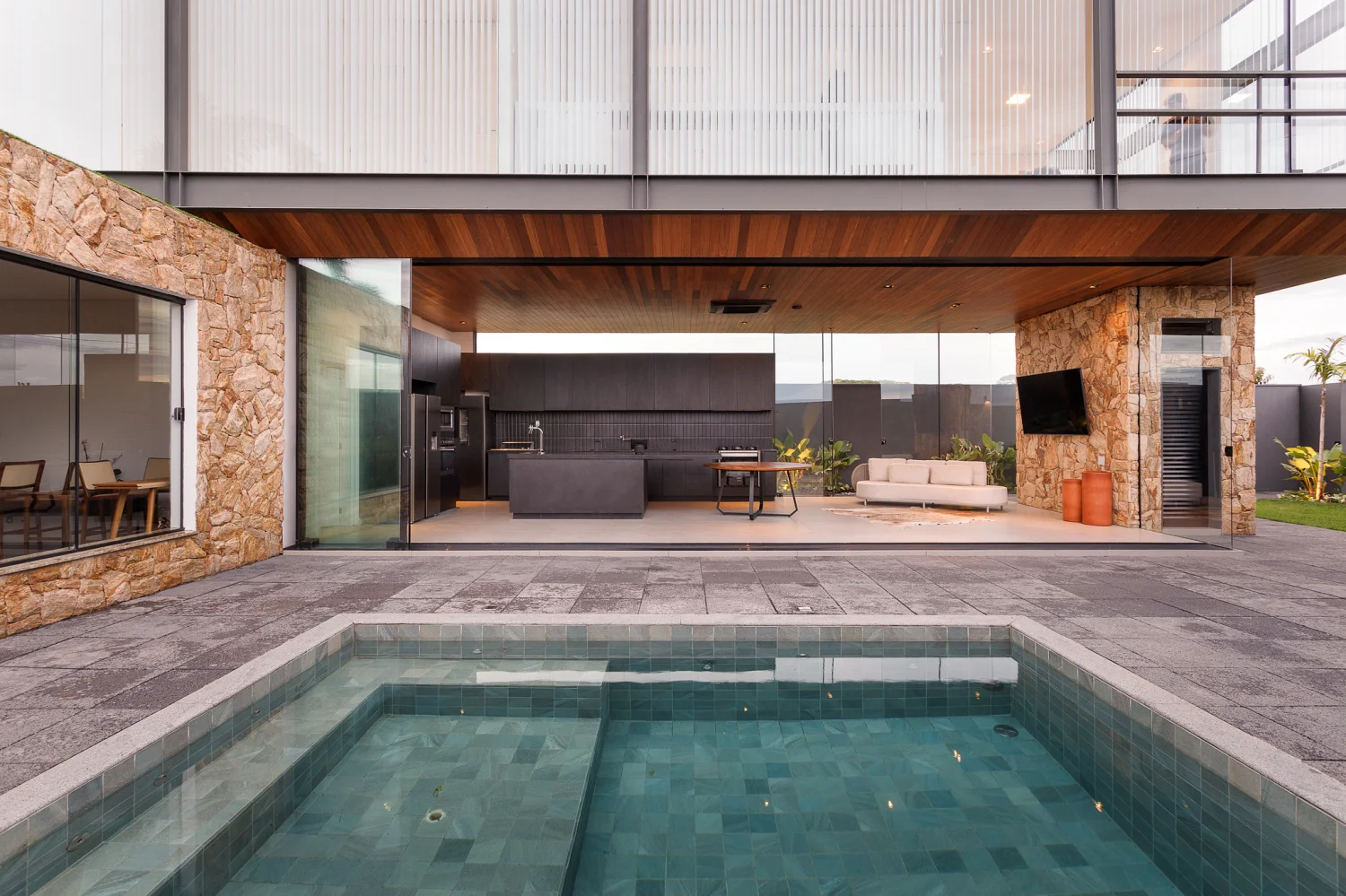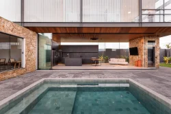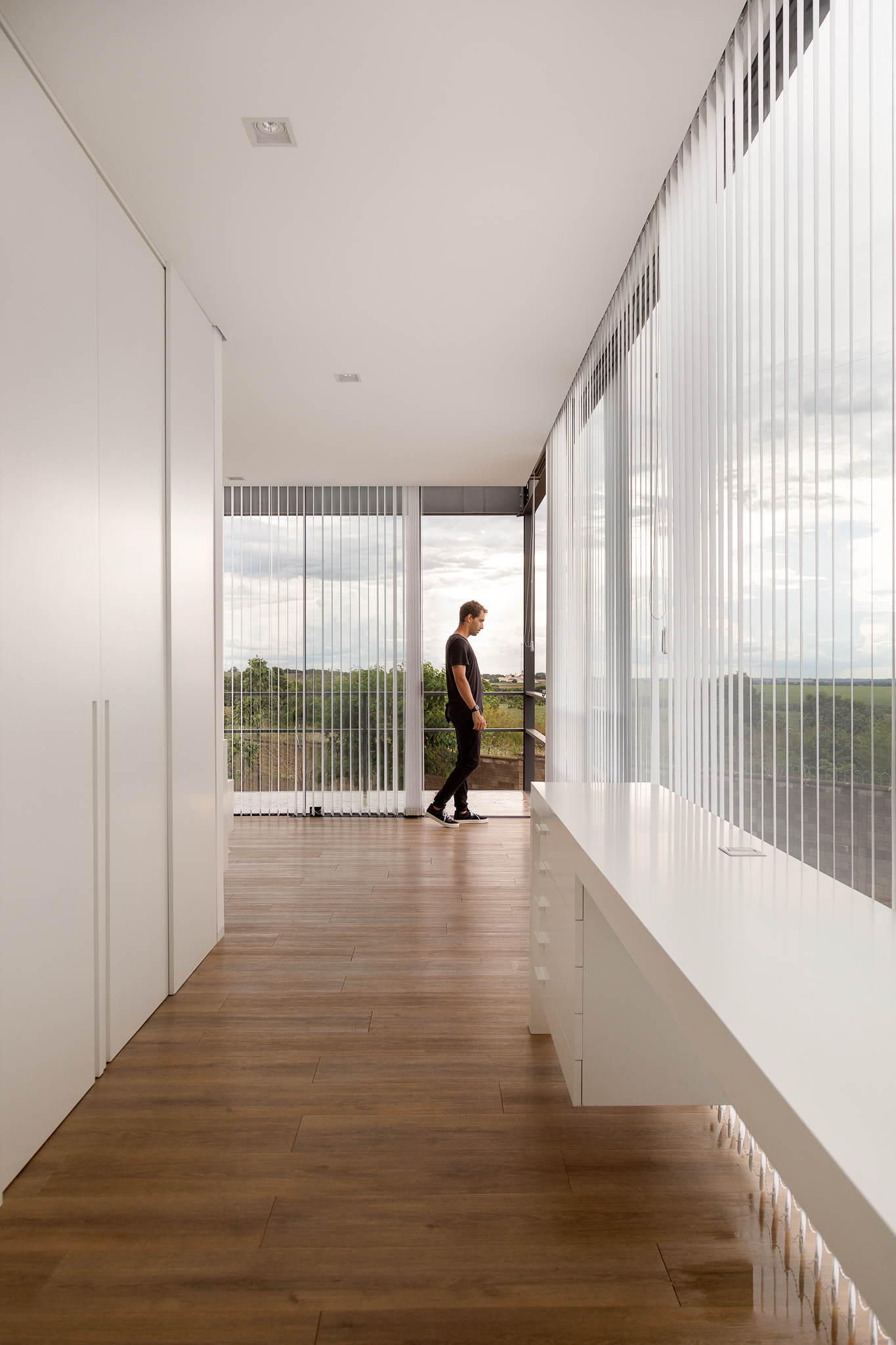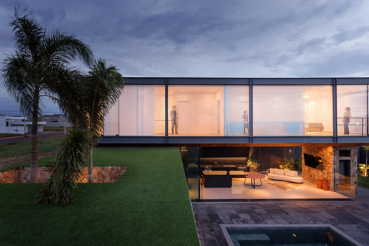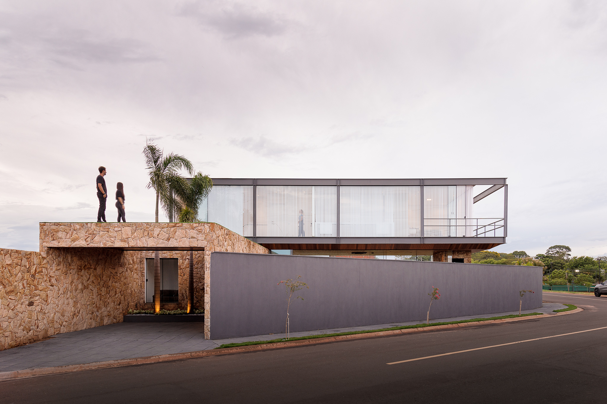 A residência localiza-se em Birigui, em um terreno triangular de 308 m² com leve aclive e vista para o skyline de Araçatuba. A implantação prioriza a face norte e utiliza a localização isolada para favorecer a contemplação. O volume superior consiste em uma estrutura de vidro e aço que paira sobre a base, criando a sensação de uma passarela flutuante. A fachada norte utiliza vedação pura em vidro com controle por cortinas verticais, enquanto a estrutura metálica garante leveza ao conjunto.