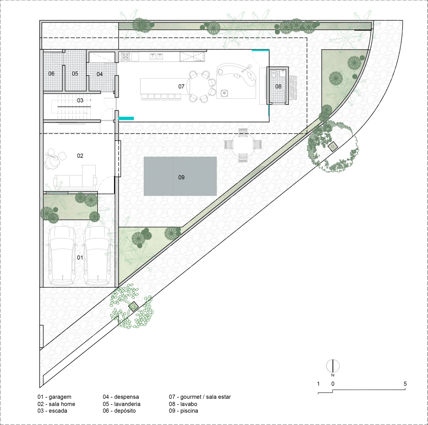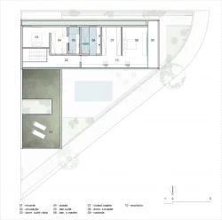 O programa organiza-se em dois pavimentos. No inferior, a área social e de serviços ocupa o eixo do lote, protegida pela projeção do andar superior que funciona como uma marquise. O acesso ao nível íntimo ocorre por uma escada em chapa metálica dobrada. No pavimento superior, as suítes são conectadas por uma circulação envidraçada voltada para o horizonte. O projeto conta ainda com uma praça aberta sobre o volume de alvenaria inferior, explorando diferentes níveis e vazios.