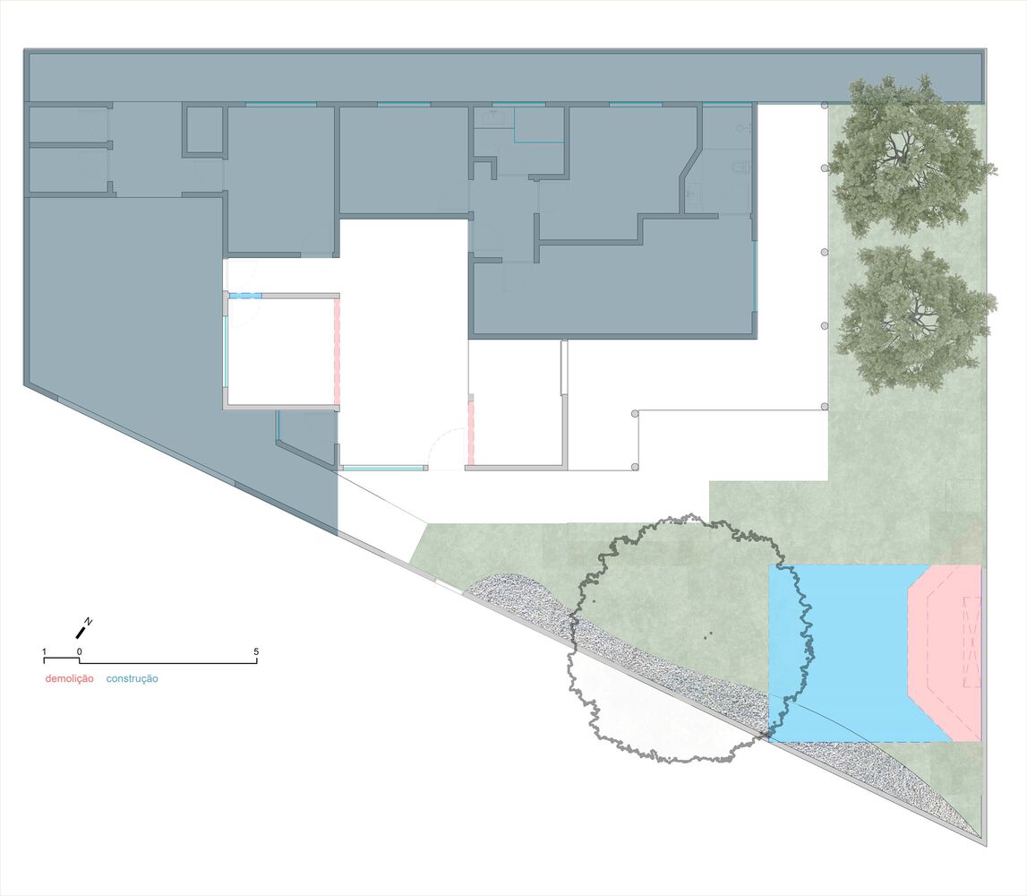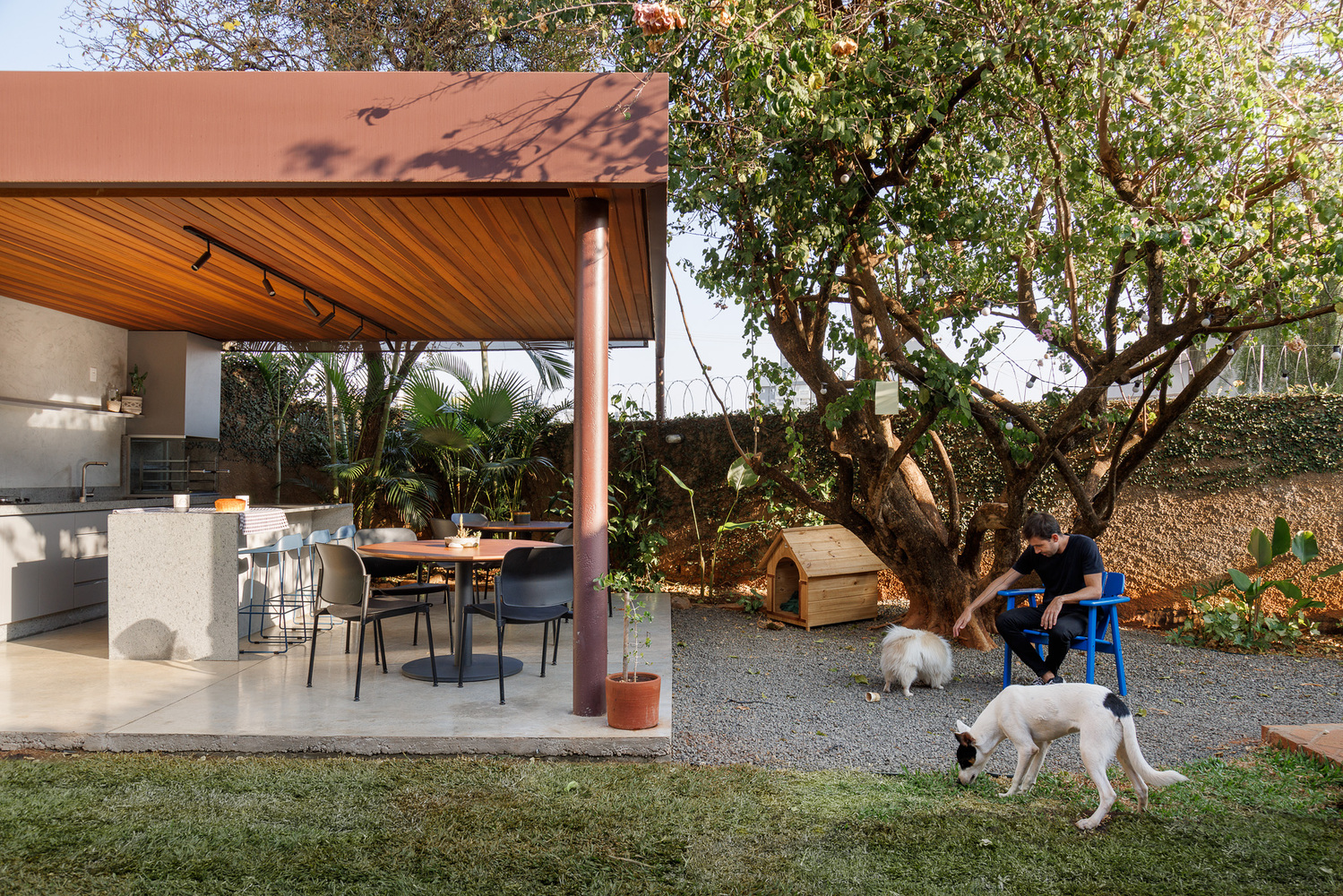 Para complementar a reforma, expandimos a cobertura metálica, transformando-a em um espaço no jardim. Seu maior destaque é uma árvore primavera de mais de 20 anos, cujos troncos tortos e copa generosa proporcionam sombra e conforto. Essa árvore, com sua beleza natural, se torna uma verdadeira escultura viva, emoldurando o ambiente e criando um local perfeito para reuniões familiares e celebrações.