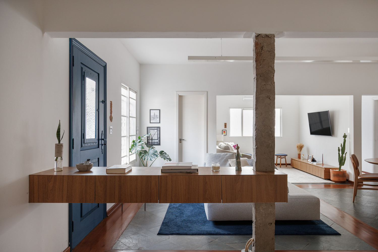 Durante a reforma, fizemos uma descoberta interessante: um pilar em concreto, escondido sob camadas de acabamento anterior. Esse pilar, ao ser revelado, foi cuidadosamente integrado ao novo design, abraçado por um móvel suspenso desenhado. Essa combinação não apenas preservou a história da casa, mas também adicionou um elemento arquitetônico intrigante ao espaço.