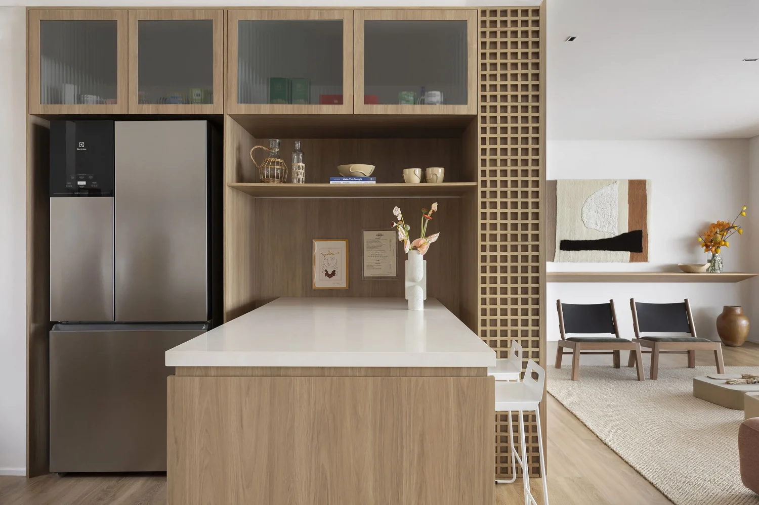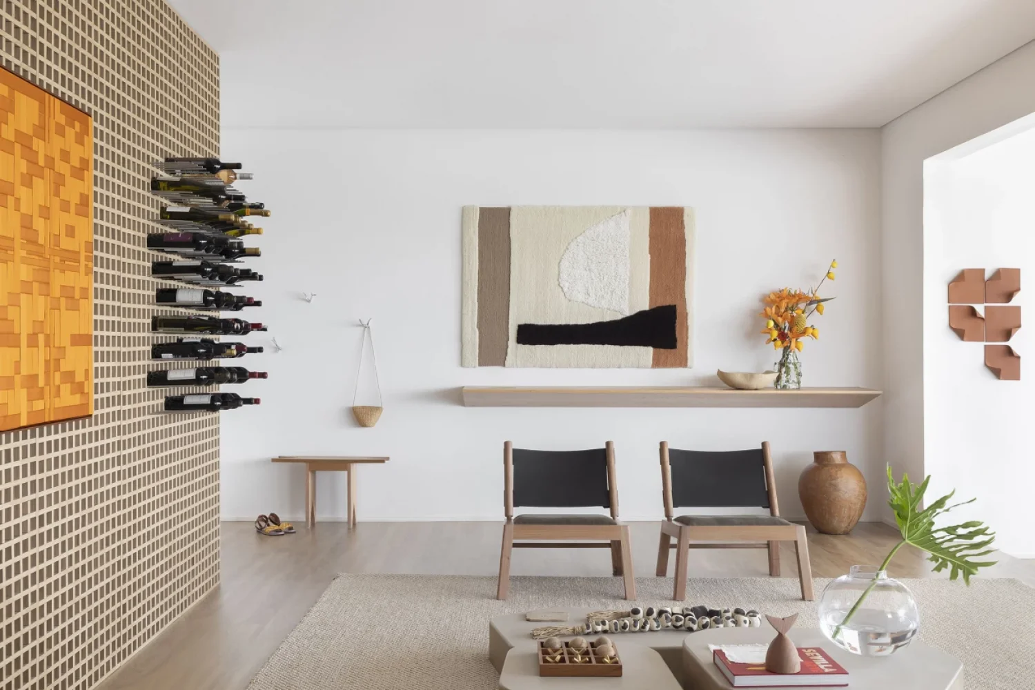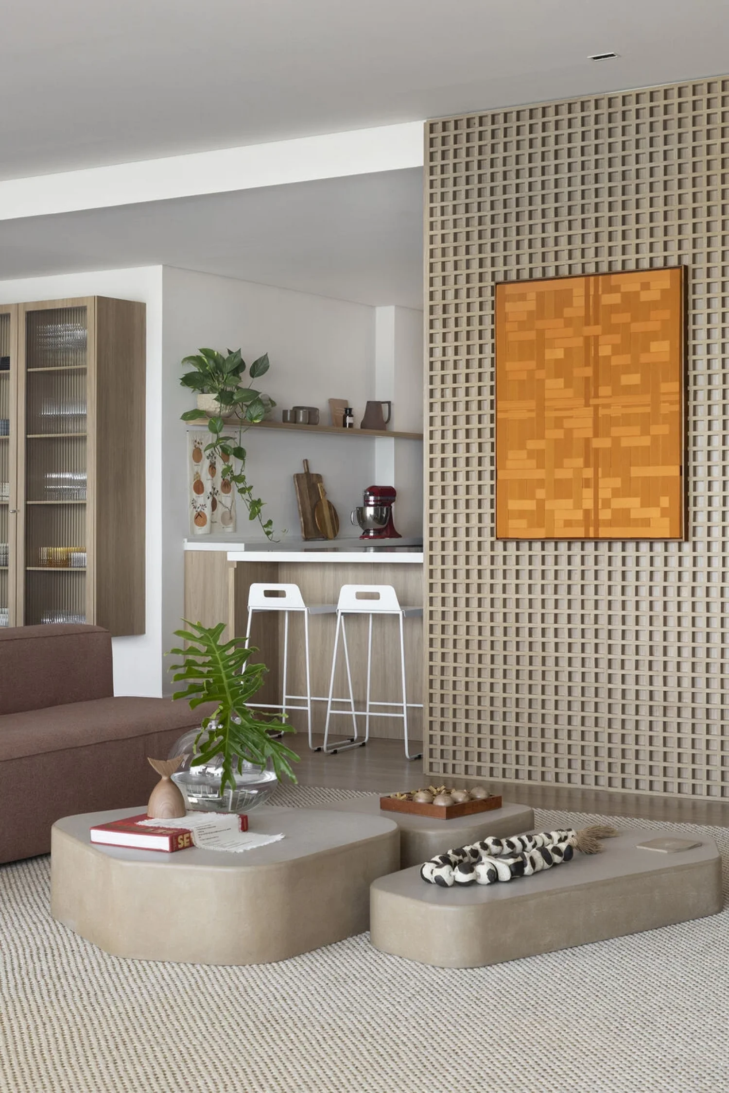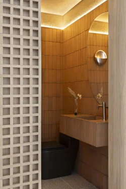 A marcenaria executada sob medida combina superfícies lisas com elementos em muxarabi, desempenhando um papel central na identidade visual do projeto. Esses painéis treliçados aparecem na cabeceira da suíte master e na parede que se estende do hall de entrada até a área de estar, incorporando uma adega próxima à cozinha e ocultando a porta do lavabo. O lavabo destaca-se pelo revestimento das paredes em tijolo de cimento e por uma cuba esculpida no mesmo material, valorizados por uma iluminação intimista. A seleção do mobiliário privilegiou o design brasileiro e o contraste de texturas, resultando em uma composição equilibrada que reflete a identidade dos moradores.