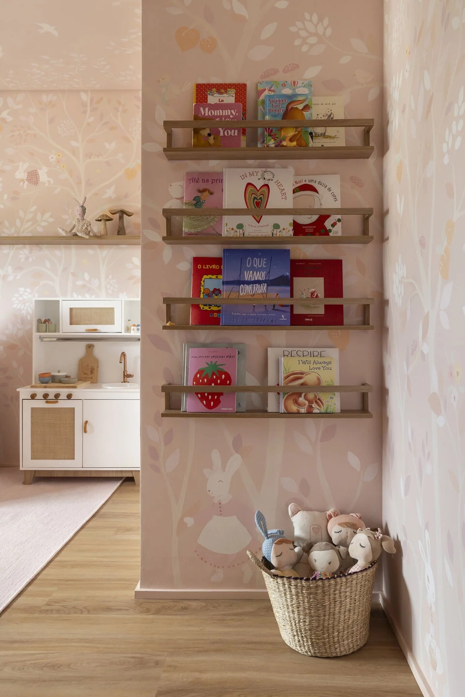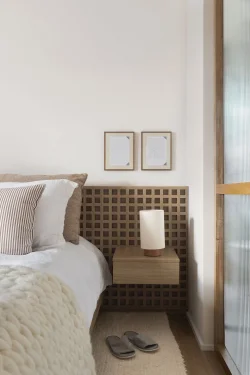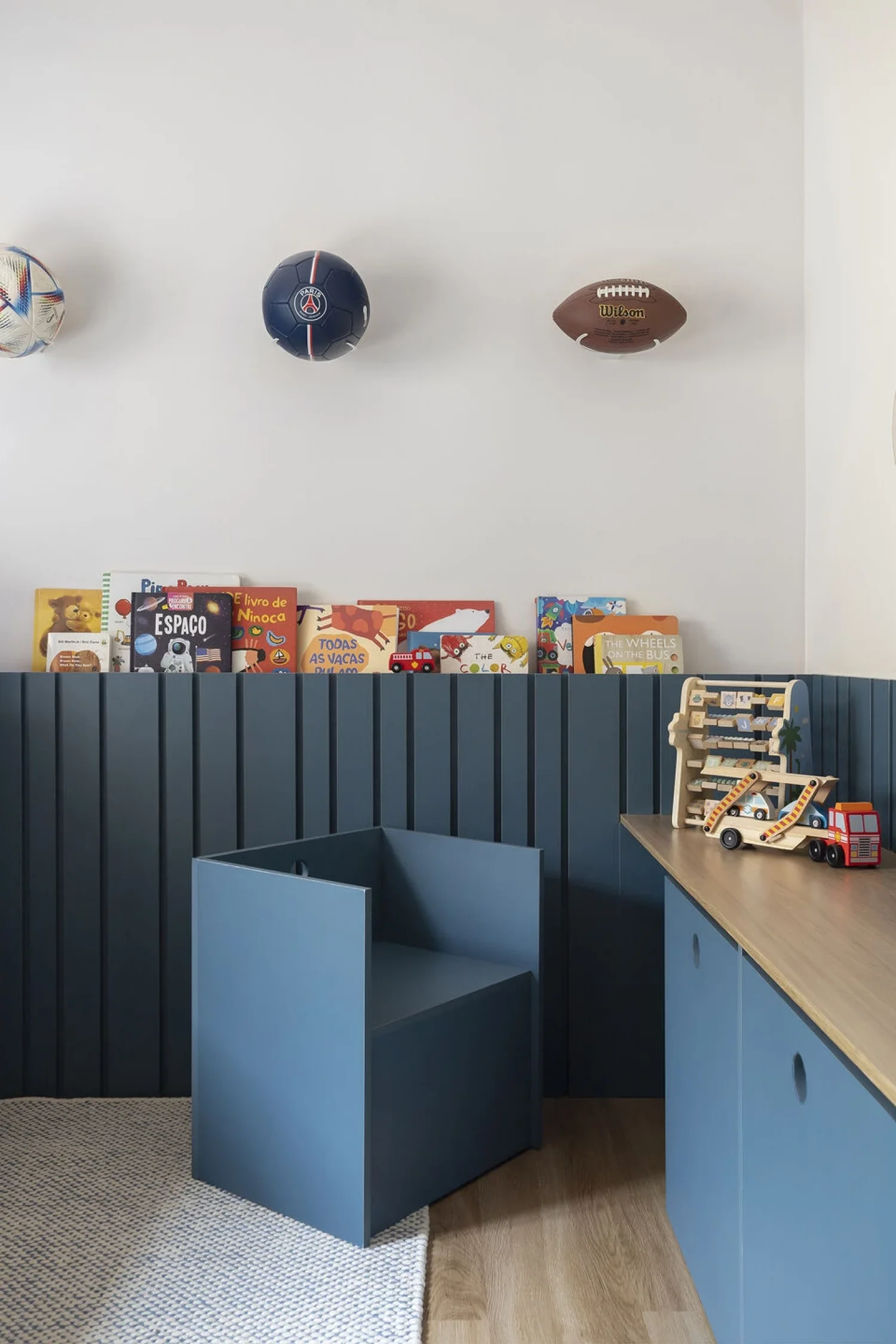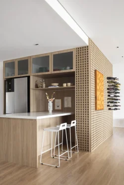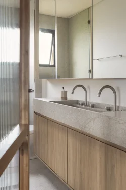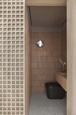 A marcenaria executada sob medida combina superfícies lisas com elementos em muxarabi, desempenhando um papel central na identidade visual do projeto. Esses painéis treliçados aparecem na cabeceira da suíte master e na parede que se estende do hall de entrada até a área de estar, incorporando uma adega próxima à cozinha e ocultando a porta do lavabo. O lavabo destaca-se pelo revestimento das paredes em tijolo de cimento e por uma cuba esculpida no mesmo material, valorizados por uma iluminação intimista. A seleção do mobiliário privilegiou o design brasileiro e o contraste de texturas, resultando em uma composição equilibrada que reflete a identidade dos moradores.