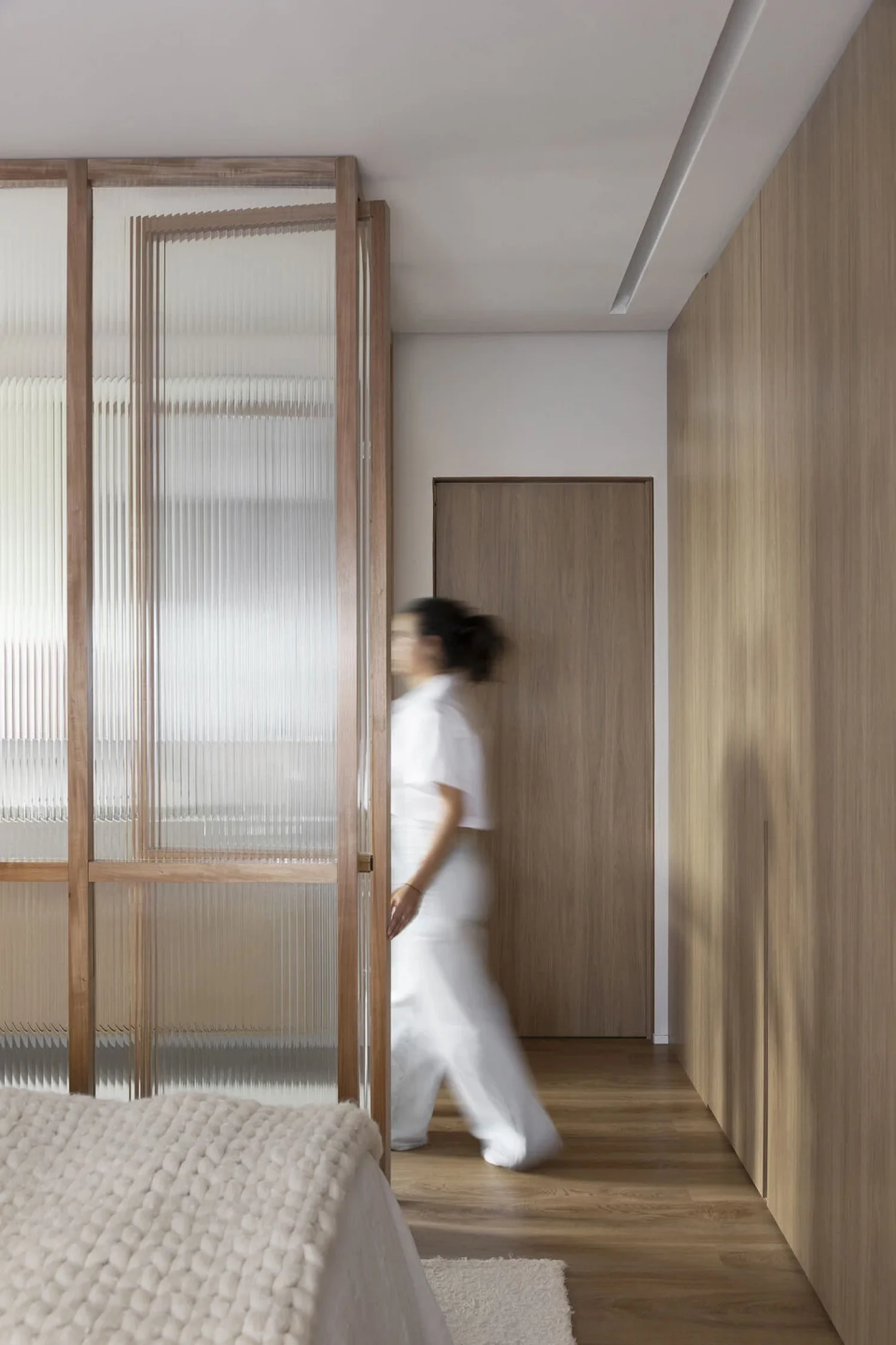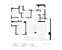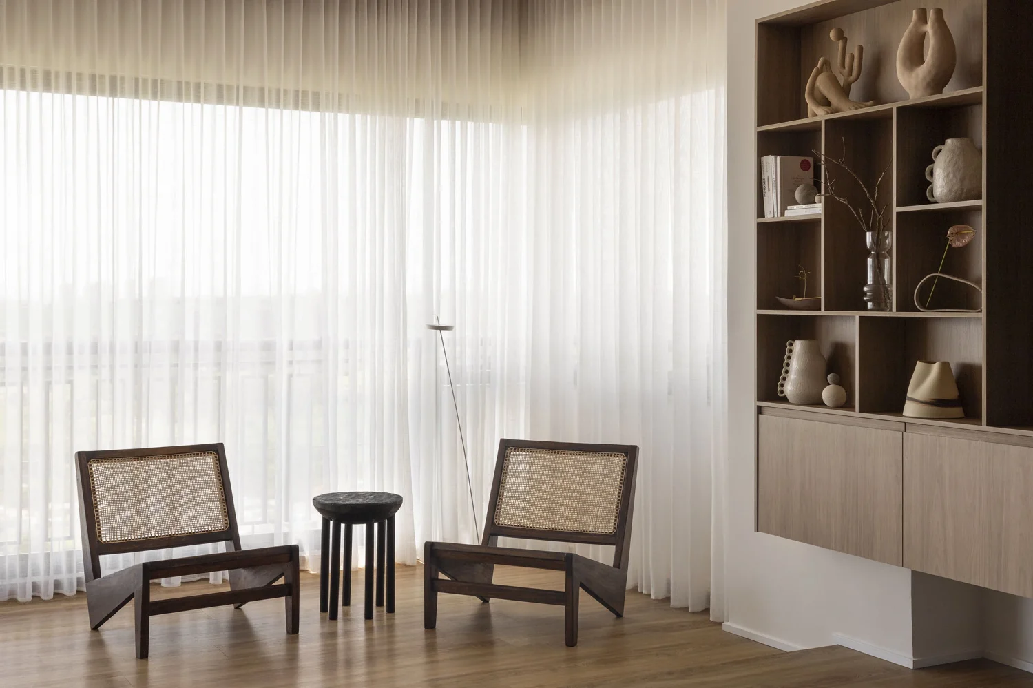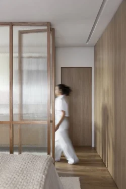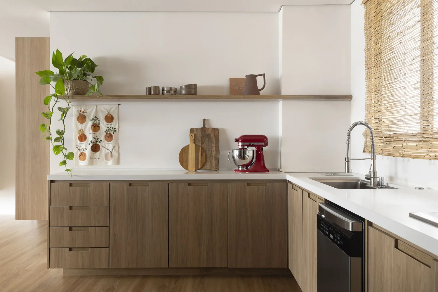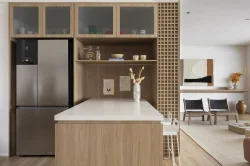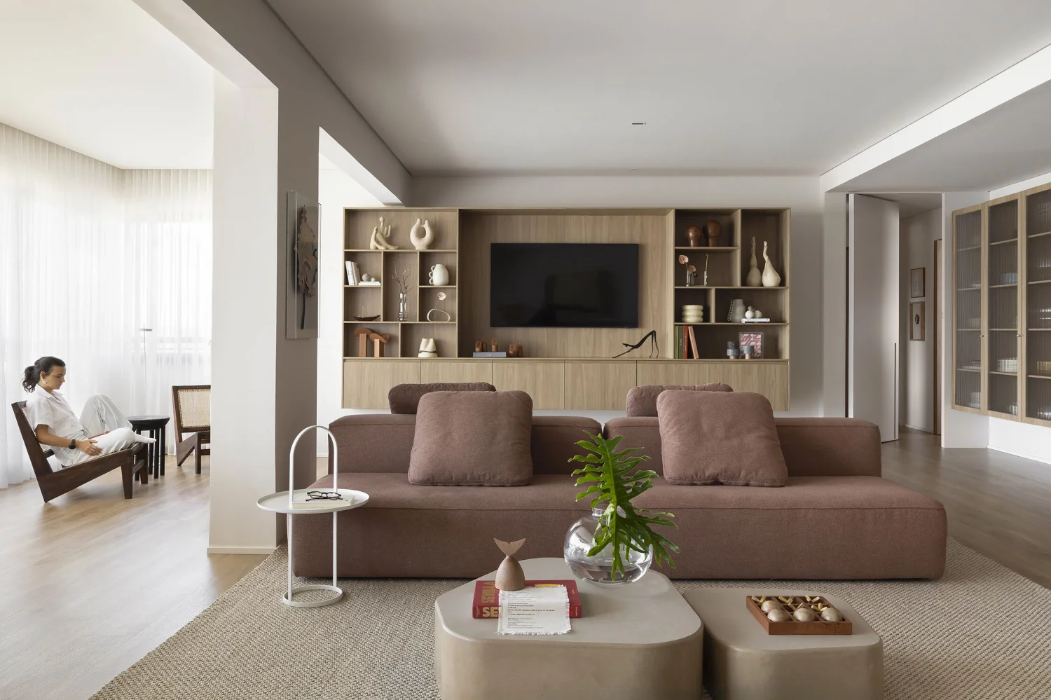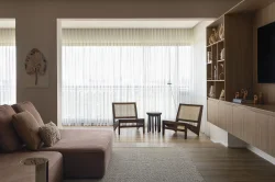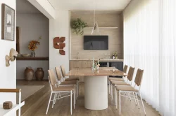 Localizado no vigésimo segundo andar de um edifício em Ribeirão Preto, o Apartamento Cedro possui aproximadamente 170 m² e oferece uma vista privilegiada da cidade. O projeto foi desenvolvido para um jovem casal com um filho, priorizando os momentos de convivência e o rigor no detalhamento técnico. Com o objetivo de criar fluidez na área social e maximizar a entrada de luz natural, a parede que separava a cozinha e os caixilhos da varanda foram removidos. A conexão entre os ambientes foi reforçada pela utilização de um piso único em tom amadeirado por toda a extensão do imóvel, com exceção dos banheiros.