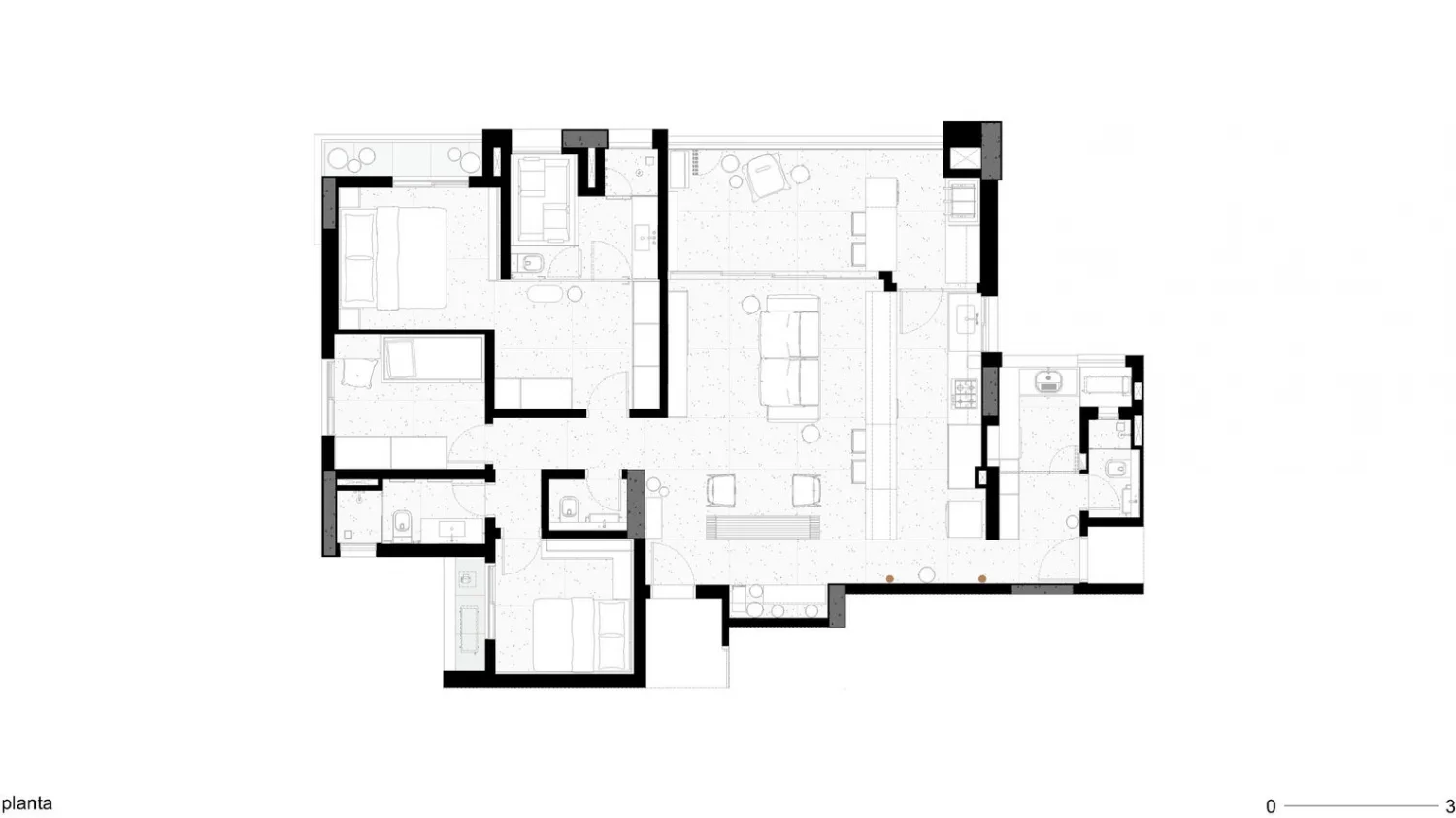 Tido a distinção das “substâncias” elementares da estruturação do arquitetônica, o vácuo – espaço livre – seria então trabalhado de forma oposta, ou seja, pela mistura/integração entre os ambientes, ocasionada pela ausência de fechamentos. Assim, buscou-se a fluidez genérica sem a imputação de portas que o uso não determinasse a sua existência. Mais precisamente, a partir do acesso ao apartamento só ocorrem tais fechamentos para os quartos e banheiros, sendo todo o resto passível de diluição da circulação. Além da ausência de portas, a continuidade isonômica, quase irrestrita, dos materiais aplicados ao piso e ao teto reforçam esse caráter de homogeneidade dos distintos espaços. Assim, o principal serviço engendrado no apartamento foi, na verdade, de uma operação de desconstrução, ou melhor, a demolição de componentes que ou compartimentavam demais os espaços ou ocultavam superfícies de interesse arquitetônico. A remoção da parede divisória entre a cozinha e a sala cria uma fluidez espacial entre os ambientes. A continuidade das bancadas da ilha e da bancada molhada até a churrasqueira, amenizam a diferenciação do que é interno e externo, dando a sensação de que é tudo espaço de um mesmo uso (ou usos), além de diluir o efeito da permanência do fechamento entre as bancadas. Ao expor a laje de concreto, revelamos a verdadeira estrutura do edifício. O concreto bruto, com sua textura marcante e suas nuances sutis, demonstram efeitos permanentes das ações que a conceberam.