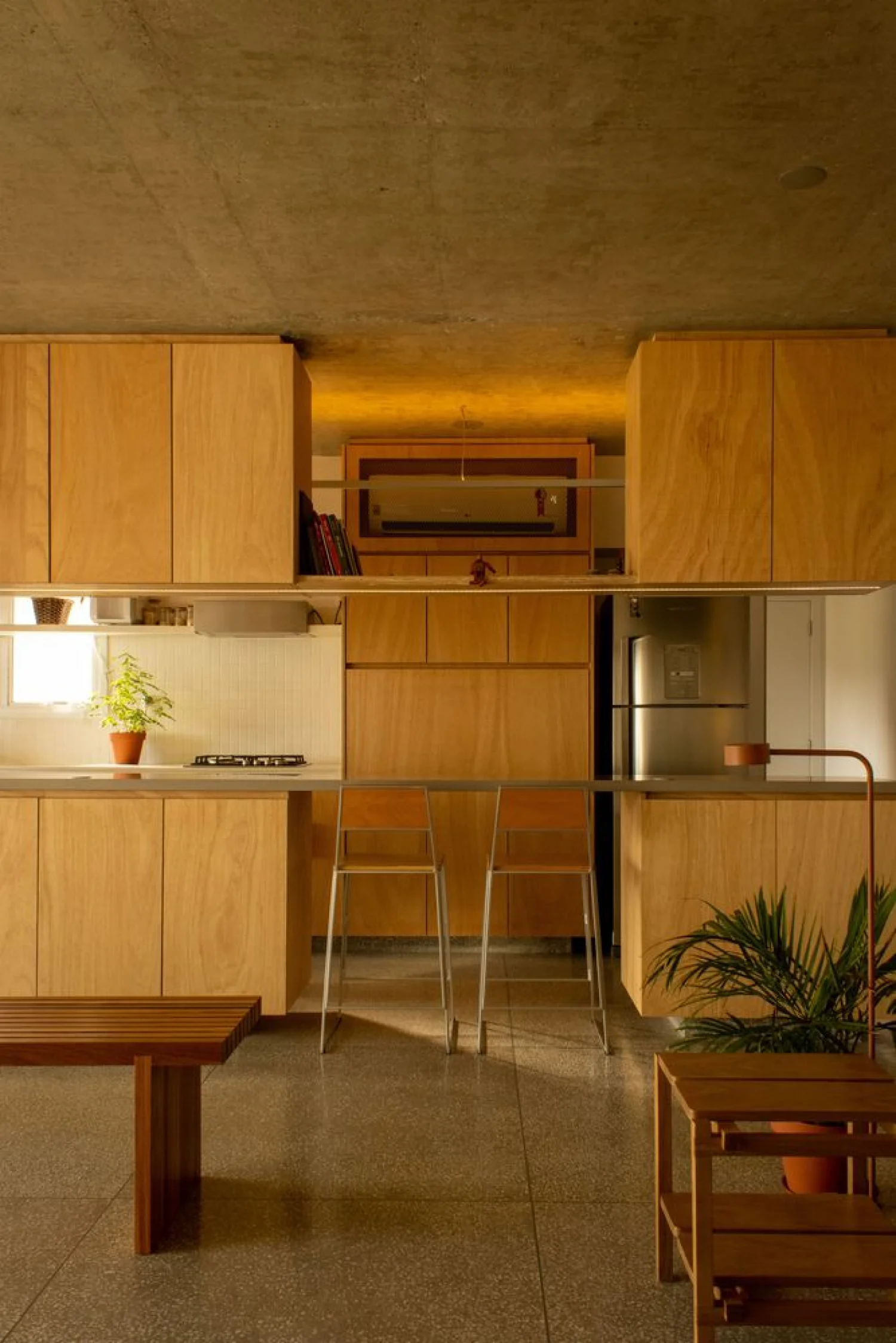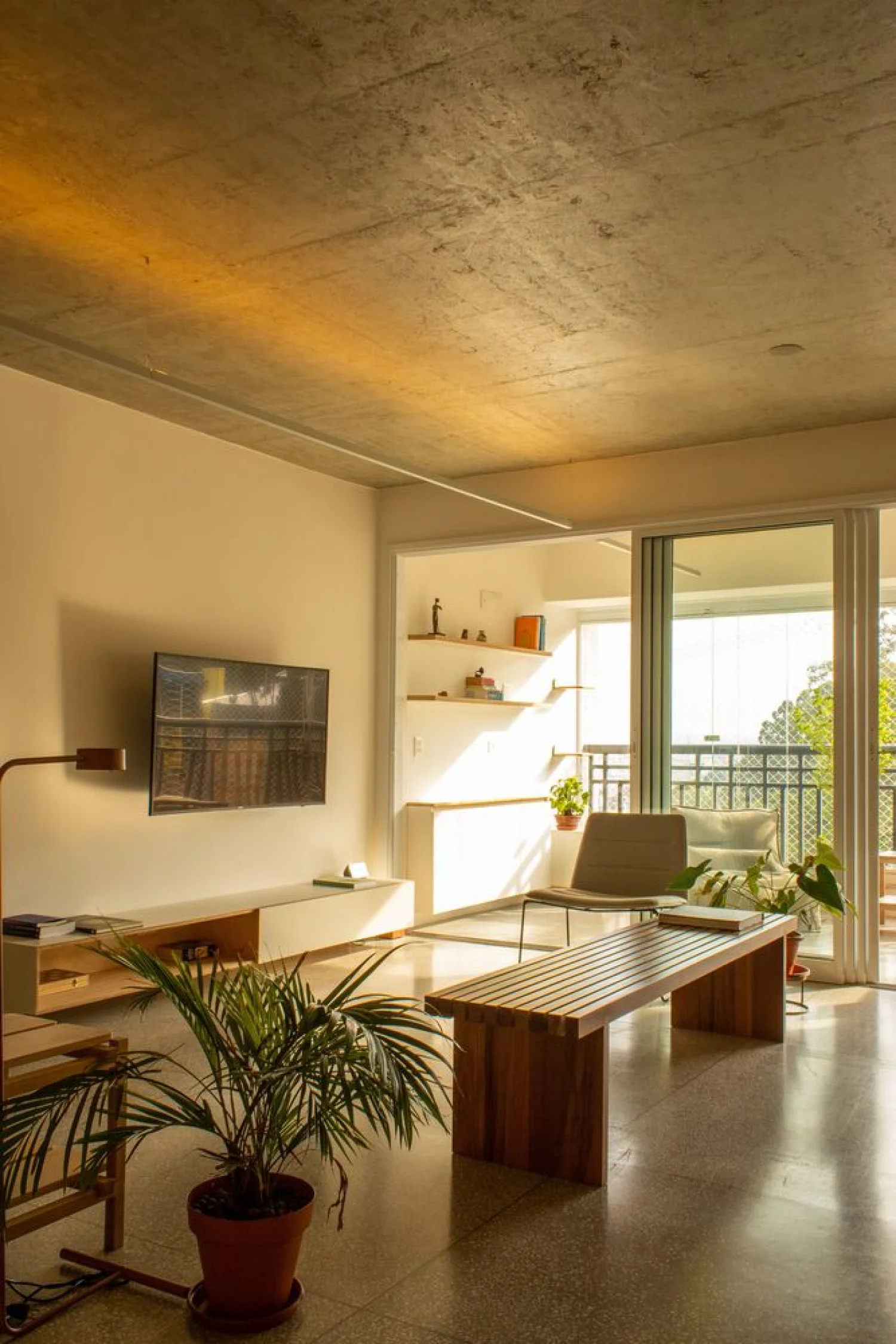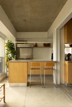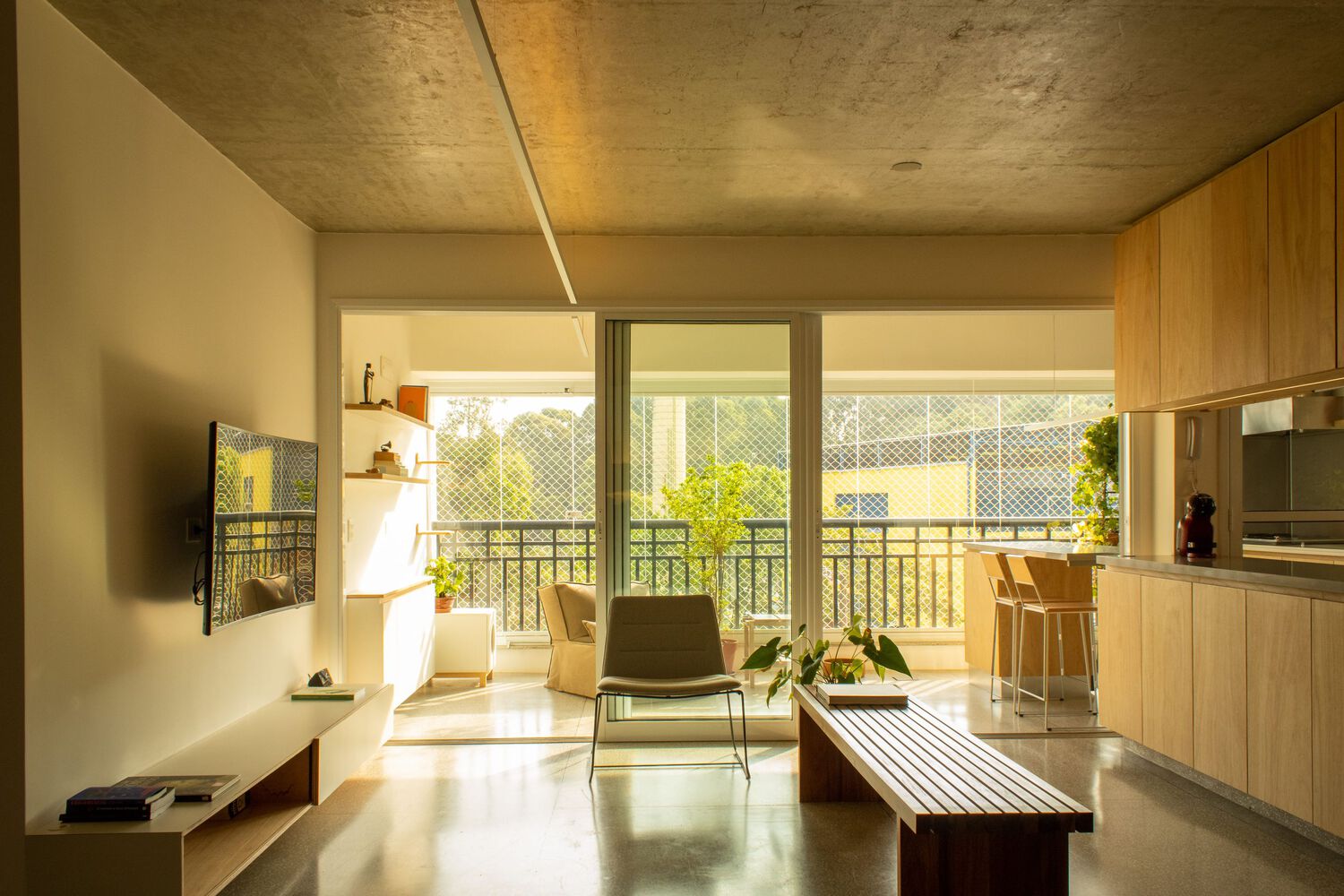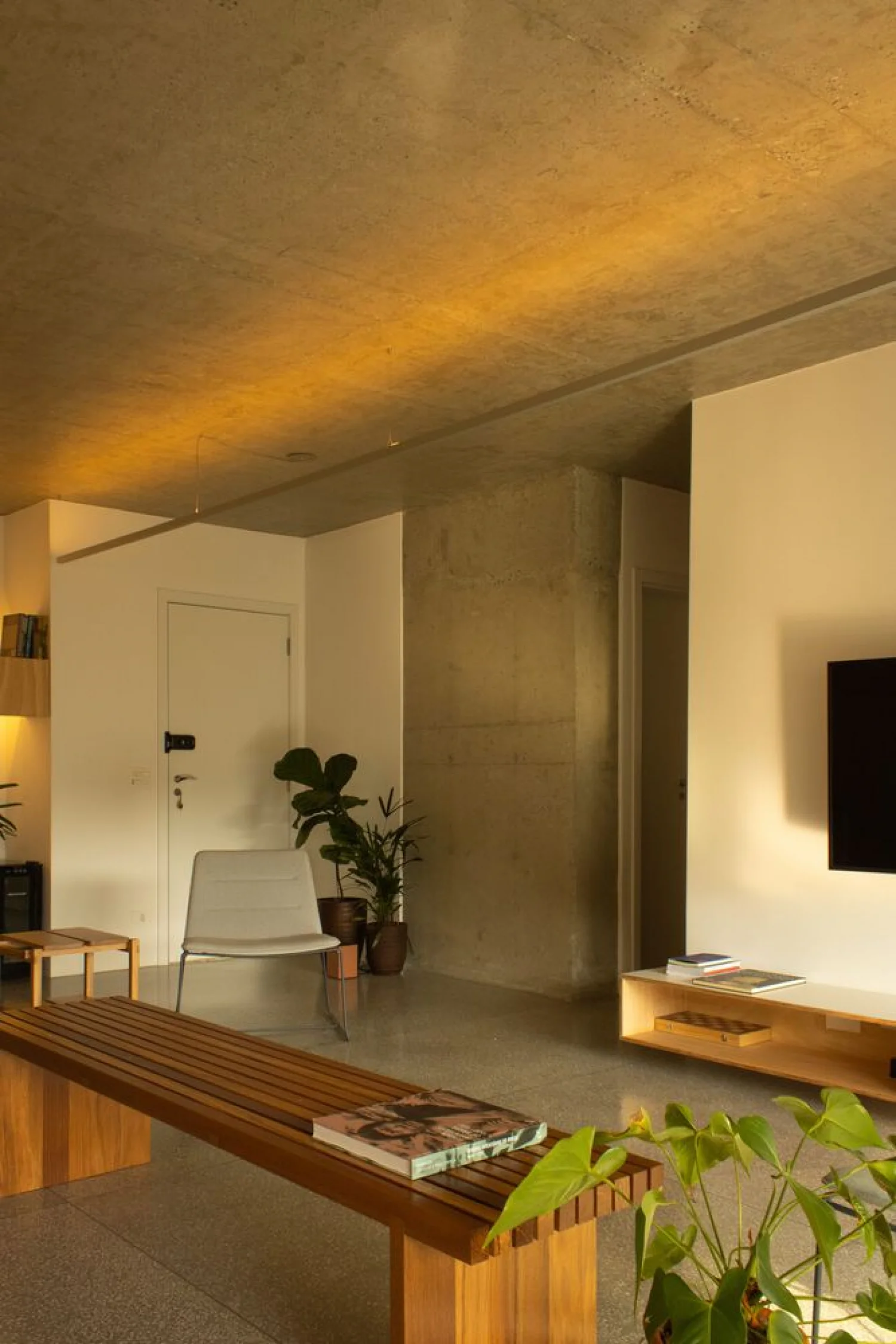 A marcenaria em madeira natural tipo compensado, dialoga harmoniosamente com o concreto, destacando os materiais em acabamento bruto e natural. Criando assim, um contraste suave entre o rústico e o polido. A presença discreta do piso em granilite funde-se ao cenário, proporcionando dois planos paralelos em cinza, piso e teto, sob mesma essência – cimento - que acabam ampliando ainda mais os espaços e valorizando tudo que acontece no seu centro. Nos banheiros, o piso de granilite também foi aplicado. Essa escolha não apenas unifica os espaços, mas também reforça a coesão visual e a praticidade em todo o apartamento. As luminárias lineares com luz de tonalidade quente e indireta projetadas na laje de concreto aparente dão o protagonismo à ela, mostrando ainda mais suas texturas, além de torna-se um elemento cênico para as dinâmicas de luz e sombra.