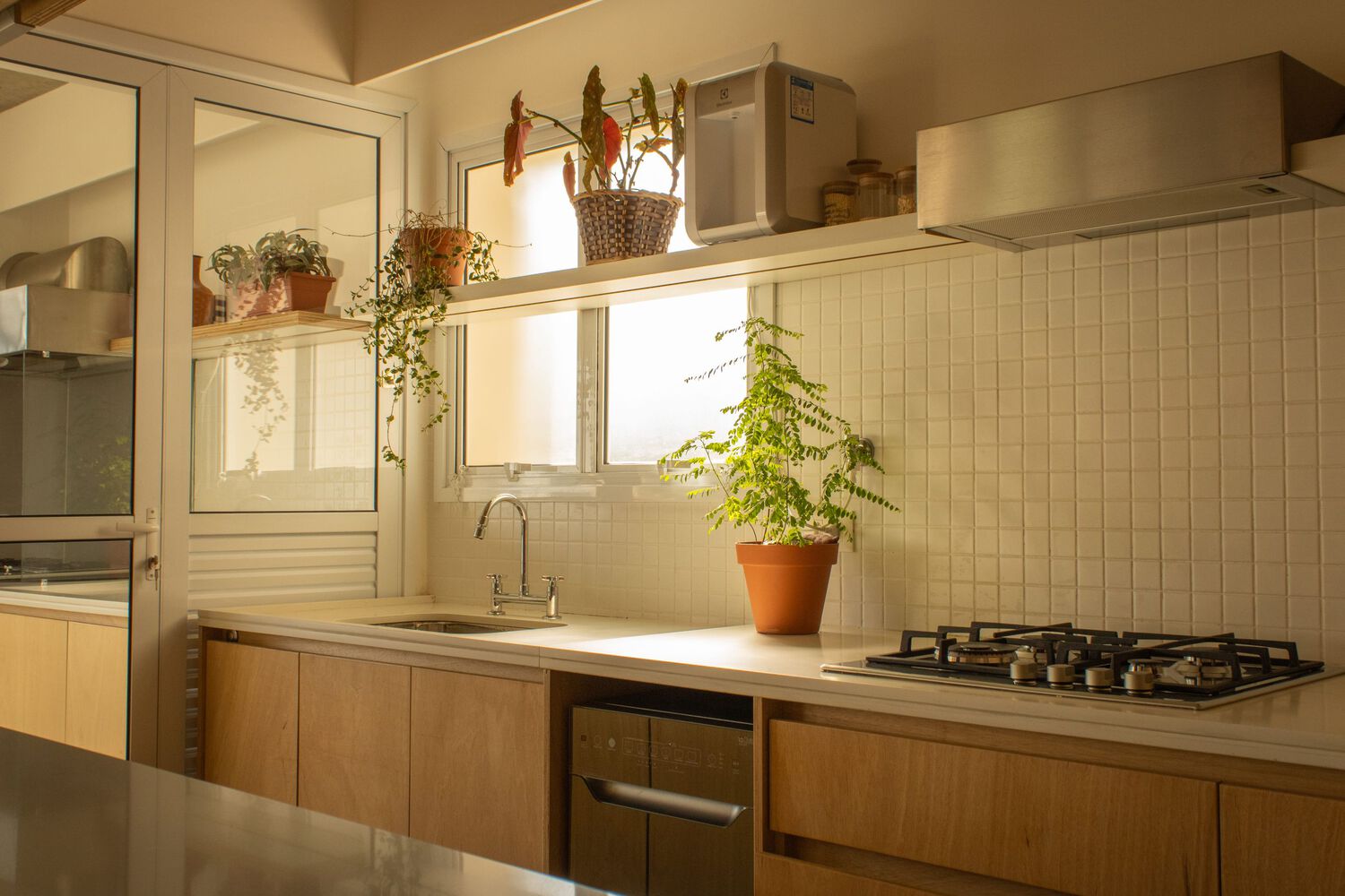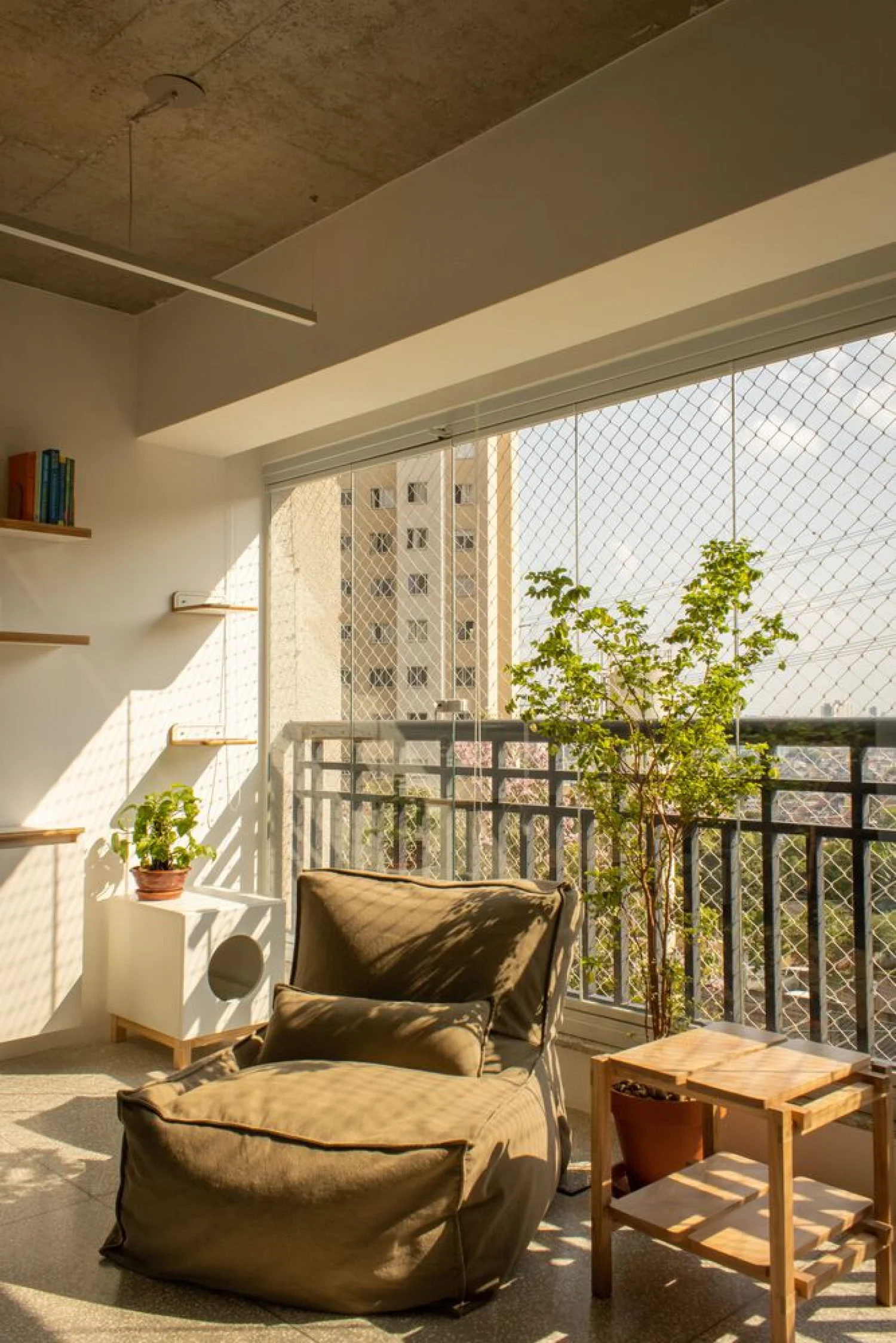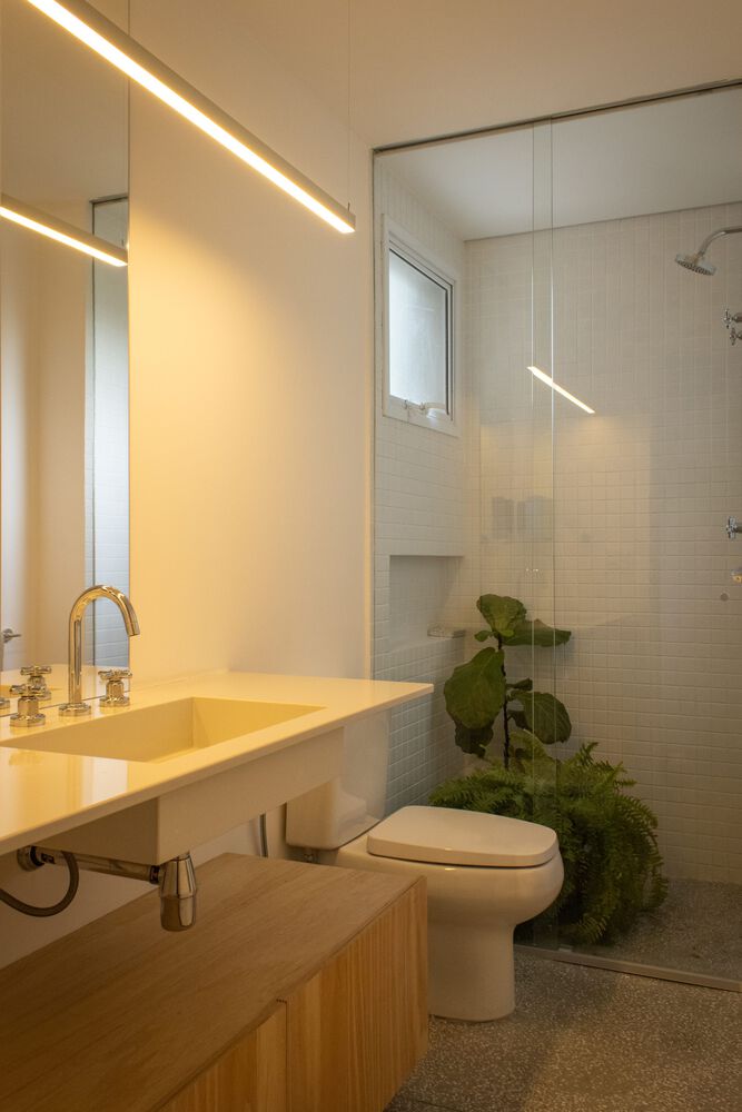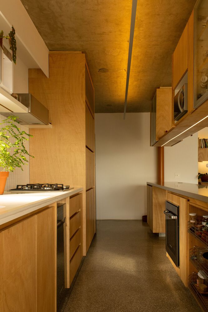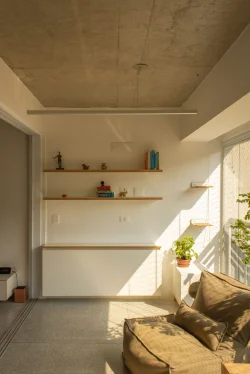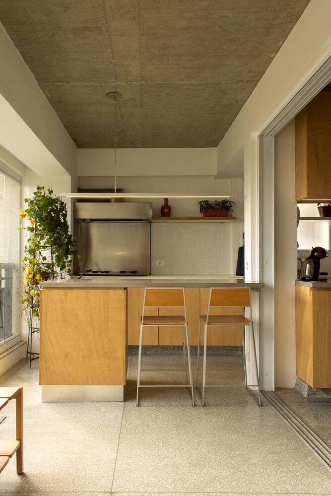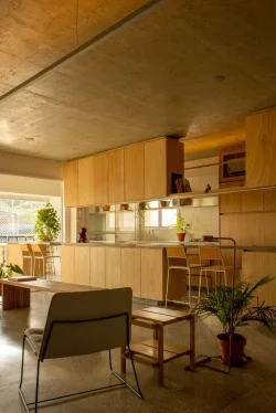 A marcenaria em madeira natural tipo compensado, dialoga harmoniosamente com o concreto, destacando os materiais em acabamento bruto e natural. Criando assim, um contraste suave entre o rústico e o polido. A presença discreta do piso em granilite funde-se ao cenário, proporcionando dois planos paralelos em cinza, piso e teto, sob mesma essência – cimento - que acabam ampliando ainda mais os espaços e valorizando tudo que acontece no seu centro. Nos banheiros, o piso de granilite também foi aplicado. Essa escolha não apenas unifica os espaços, mas também reforça a coesão visual e a praticidade em todo o apartamento. As luminárias lineares com luz de tonalidade quente e indireta projetadas na laje de concreto aparente dão o protagonismo à ela, mostrando ainda mais suas texturas, além de torna-se um elemento cênico para as dinâmicas de luz e sombra.