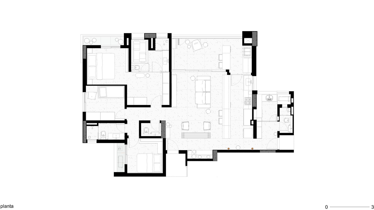 Descrição enviada pela equipe de projeto. O projeto arquitetônico para intervenção de reforma do apartamento teve como partido a fluidez dos espaços de uso compartilhado e da valorização dos materiais brutos. Nesse sentido, foram adotados conceitos antagônicos a cada um dos temas despertados na abordagem projetual: decantação e homogeneização. A decantação em questão ocorreu substituindo o processo físico da sedimentação pela raspagem, mas obtendo a separação do três elementos – fases - da composição construtiva: piso, paredes e teto. Nessa estratificação, privilegiou-se a marcação do concreto existente nos planos horizontais, enquanto que a neutralidade dos eixos verticais das paredes foram estruturados pelo vão associado ao espaçamento entre alvenarias. Marca-se, assim, faixas cinzas e branca. Ao mesmo tempo, intercalam-se elementos expostos e revestidos.
