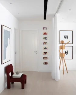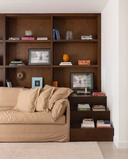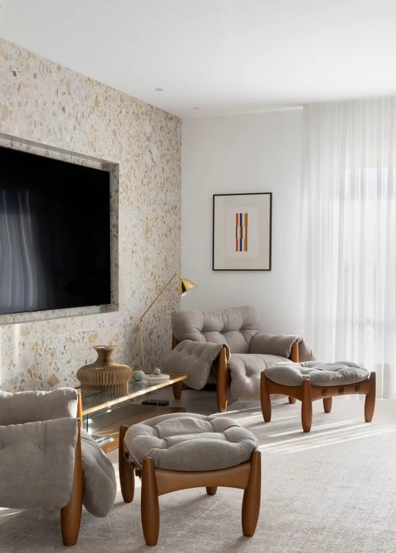 Na sala de televisão, a luz natural assume o protagonismo, interagindo com a parede revestida em pedras naturais, que introduz uma textura mineral e robusta ao espaço. Esse peso visual é equilibrado pela leveza dos tecidos naturais das cortinas da Calê Home e pelo refinamento do tapete da By Kamy. A sofisticação é acentuada pela presença das poltronas "Mole", de Sergio Rodrigues, reafirmando o compromisso do projeto com o design de alto nível. Cada detalhe, das obras de arte aos acabamentos arquitetônicos, foi planejado para que nenhum elemento se imponha isoladamente, resultando em um ambiente de profundo equilíbrio, silêncio visual e bem-estar.
