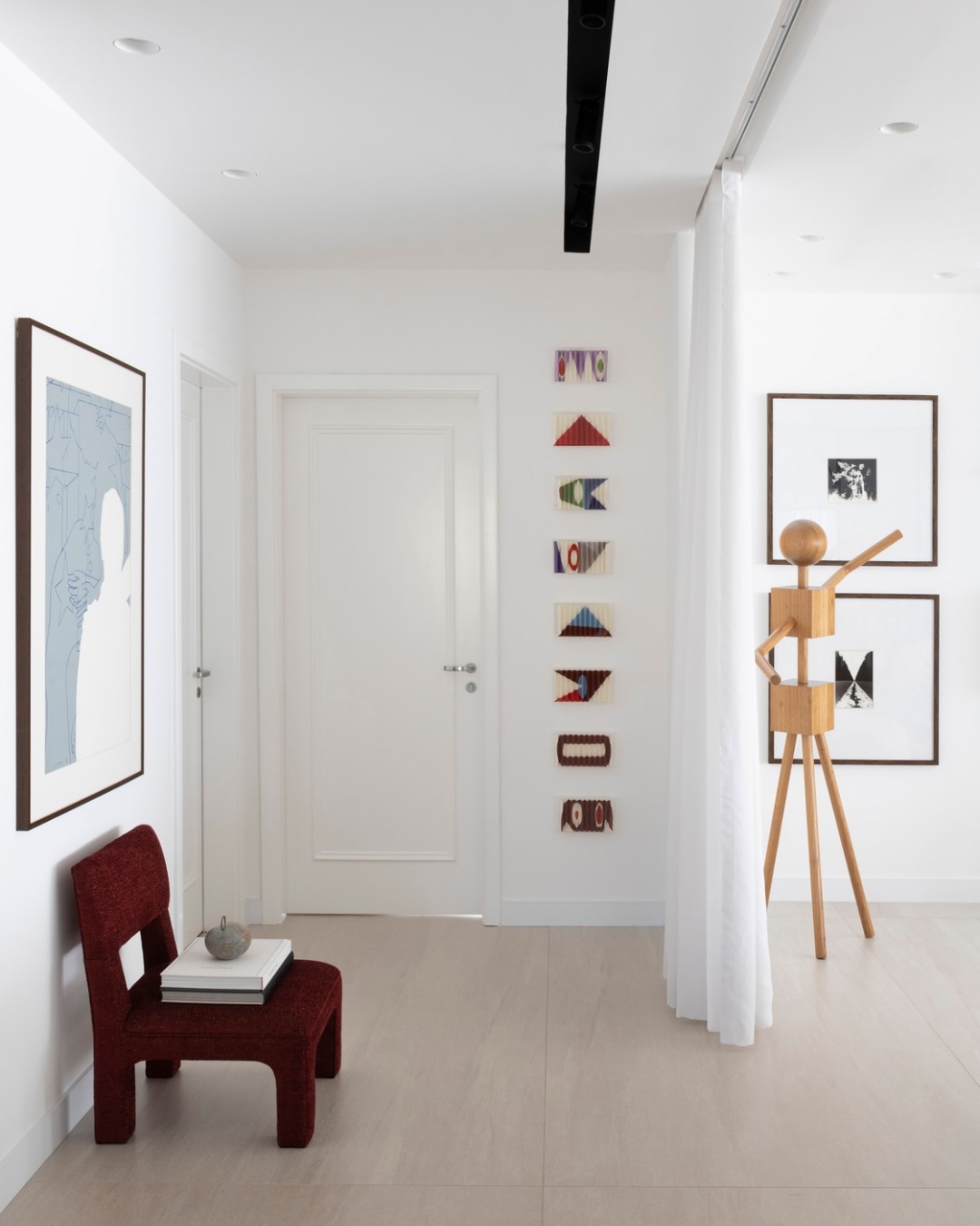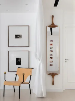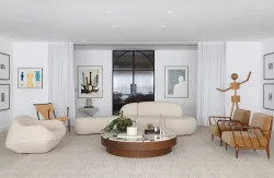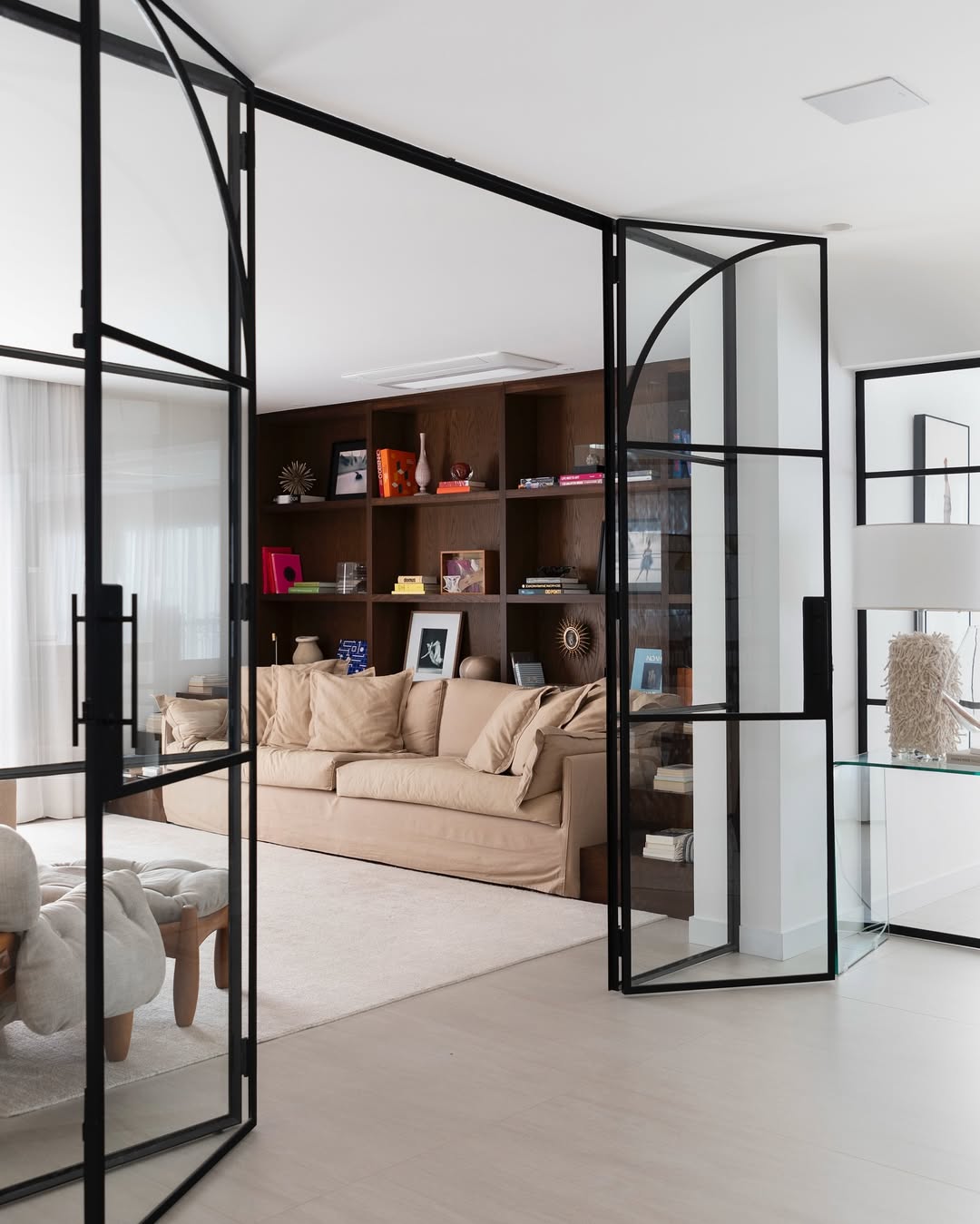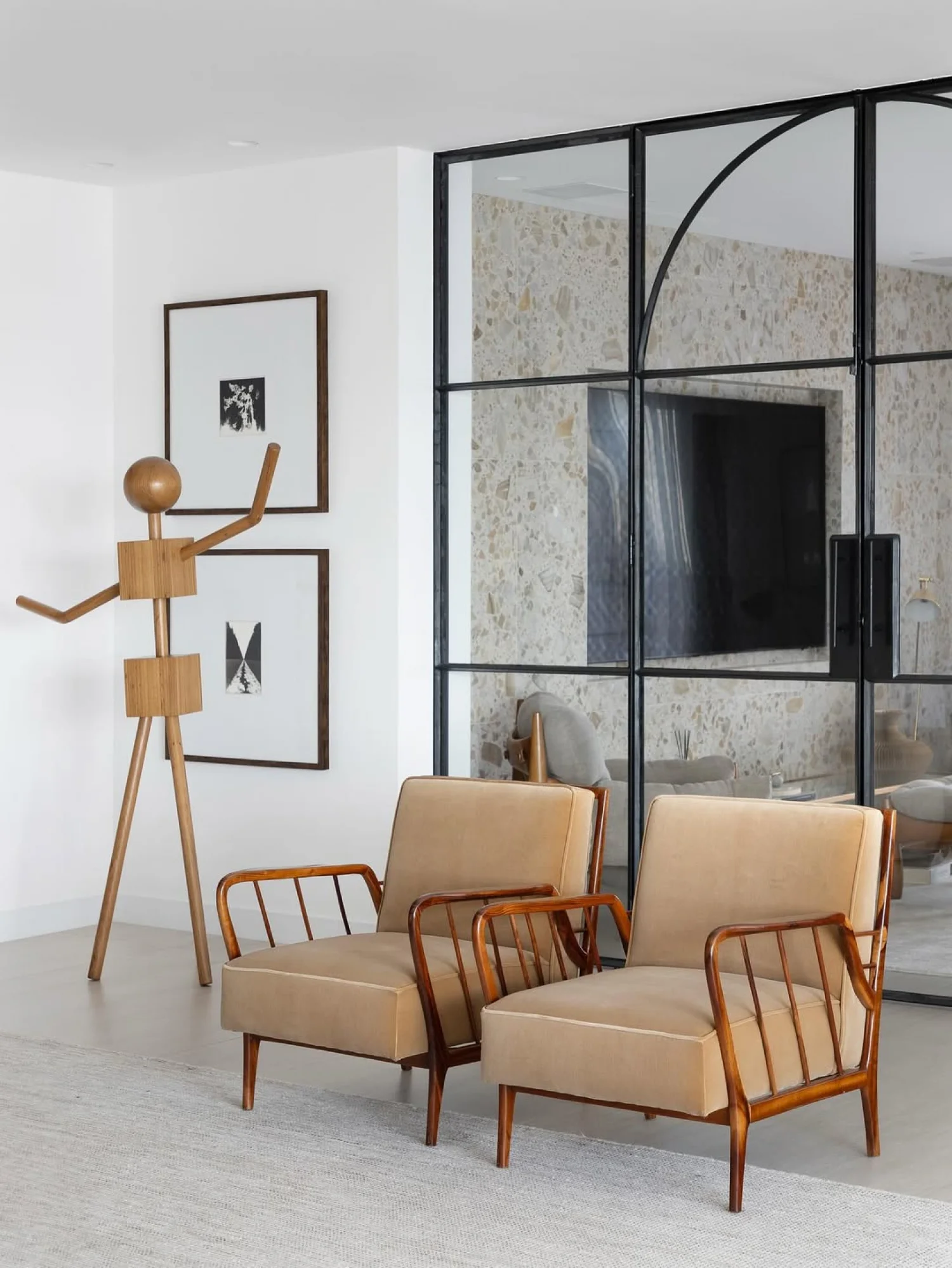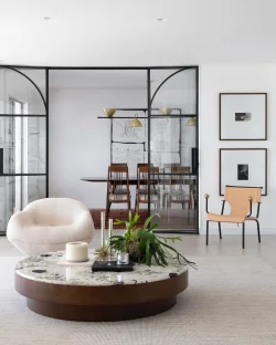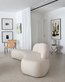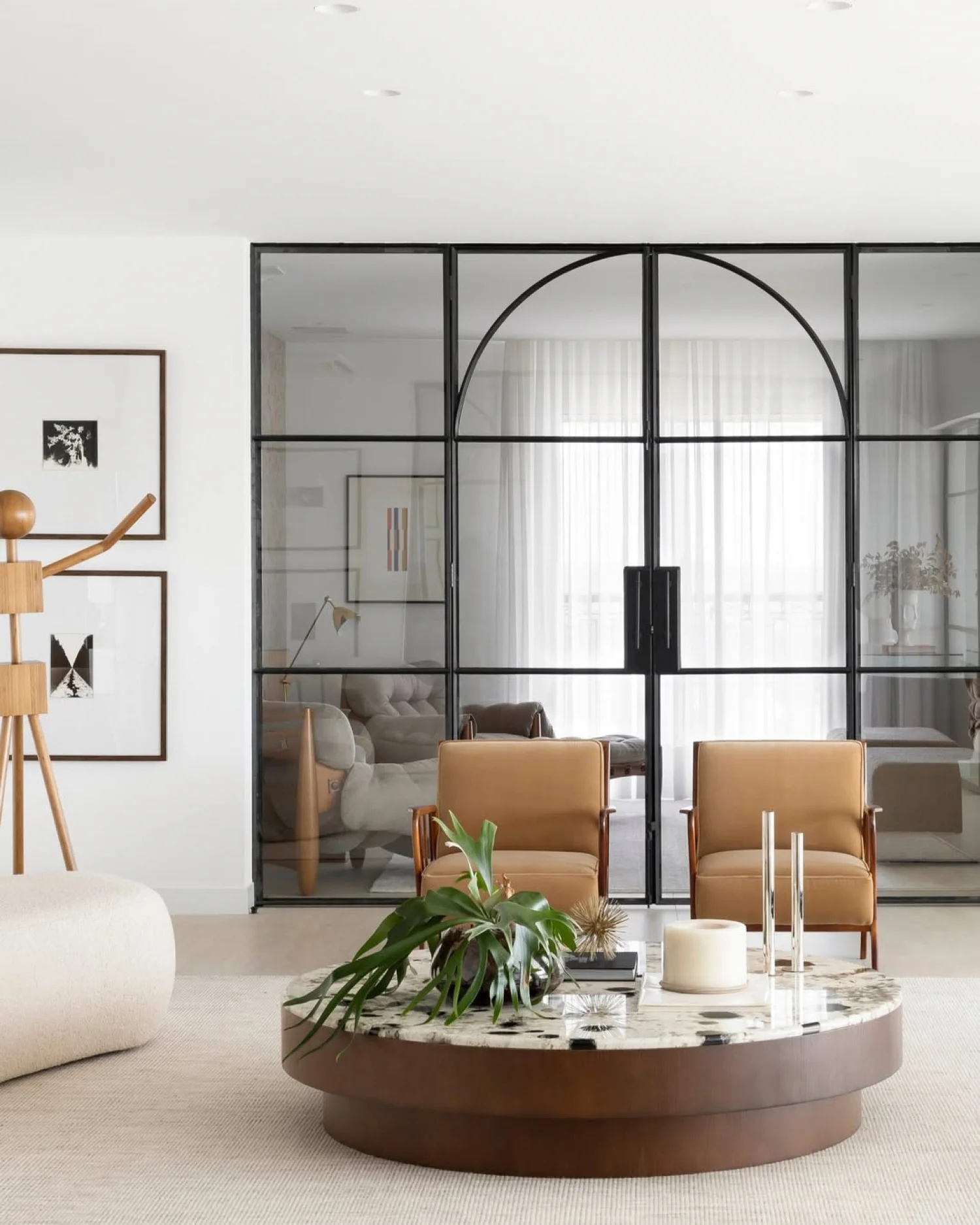 No living, a integração visual é potencializada pela transparência das esquadrias em serralheria e vidro, que delimitam o espaço sem criar barreiras ópticas. A identidade do apartamento é reforçada pelo uso de arcos e curvas delicadas, elementos que trazem uma organicidade atemporal e rompem com soluções óbvias de design. A valorização do patrimônio moderno brasileiro é central na curadoria, que reúne peças icônicas como o Mancebo LBB — manequim solicitado pela cliente — e a cadeira "Bola de Latão", ambas de Lina Bo Bardi. O acervo conta ainda com o sofá "Agulha", de Zanine de Zanine, e a poltrona "Manhattan", de Jorge Zalszupin, todos dispostos sobre um tapete de dimensões generosas que unifica a cena.