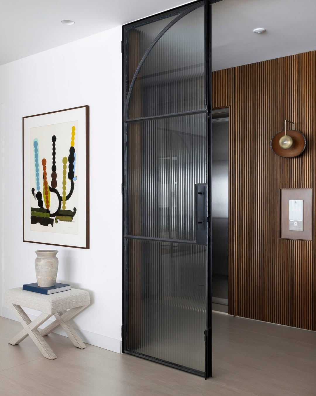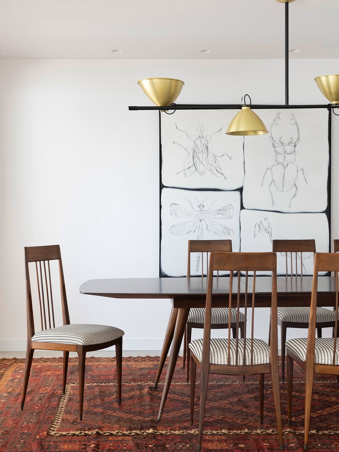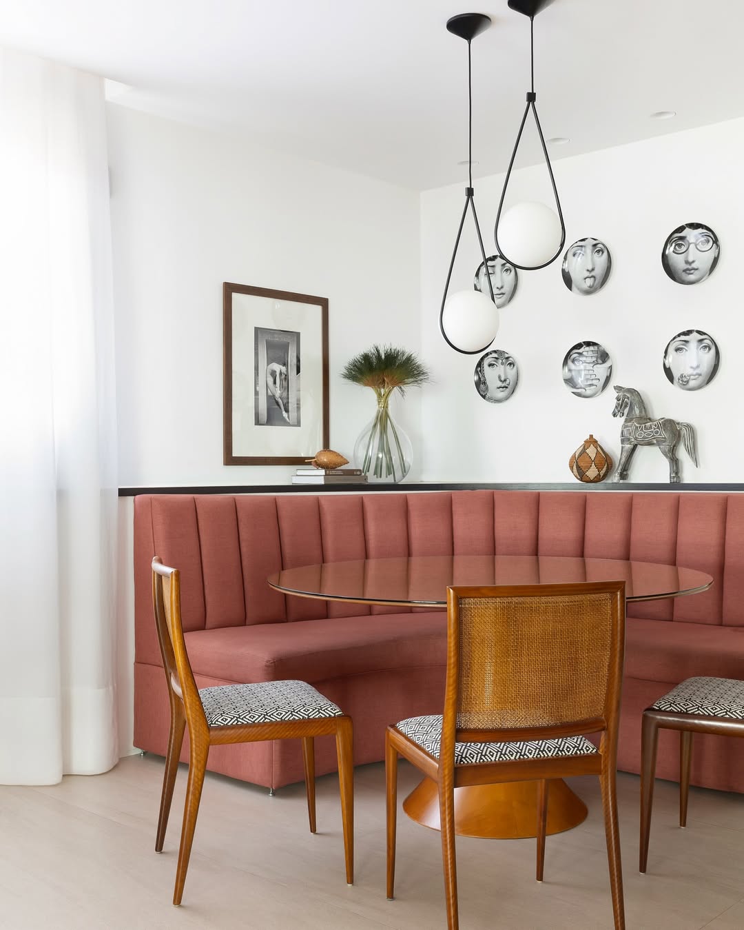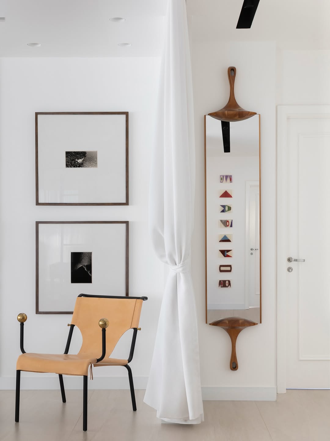 No living, a integração visual é potencializada pela transparência das esquadrias em serralheria e vidro, que delimitam o espaço sem criar barreiras ópticas. A identidade do apartamento é reforçada pelo uso de arcos e curvas delicadas, elementos que trazem uma organicidade atemporal e rompem com soluções óbvias de design. A valorização do patrimônio moderno brasileiro é central na curadoria, que reúne peças icônicas como o Mancebo LBB — manequim solicitado pela cliente — e a cadeira "Bola de Latão", ambas de Lina Bo Bardi. O acervo conta ainda com o sofá "Agulha", de Zanine de Zanine, e a poltrona "Manhattan", de Jorge Zalszupin, todos dispostos sobre um tapete de dimensões generosas que unifica a cena.